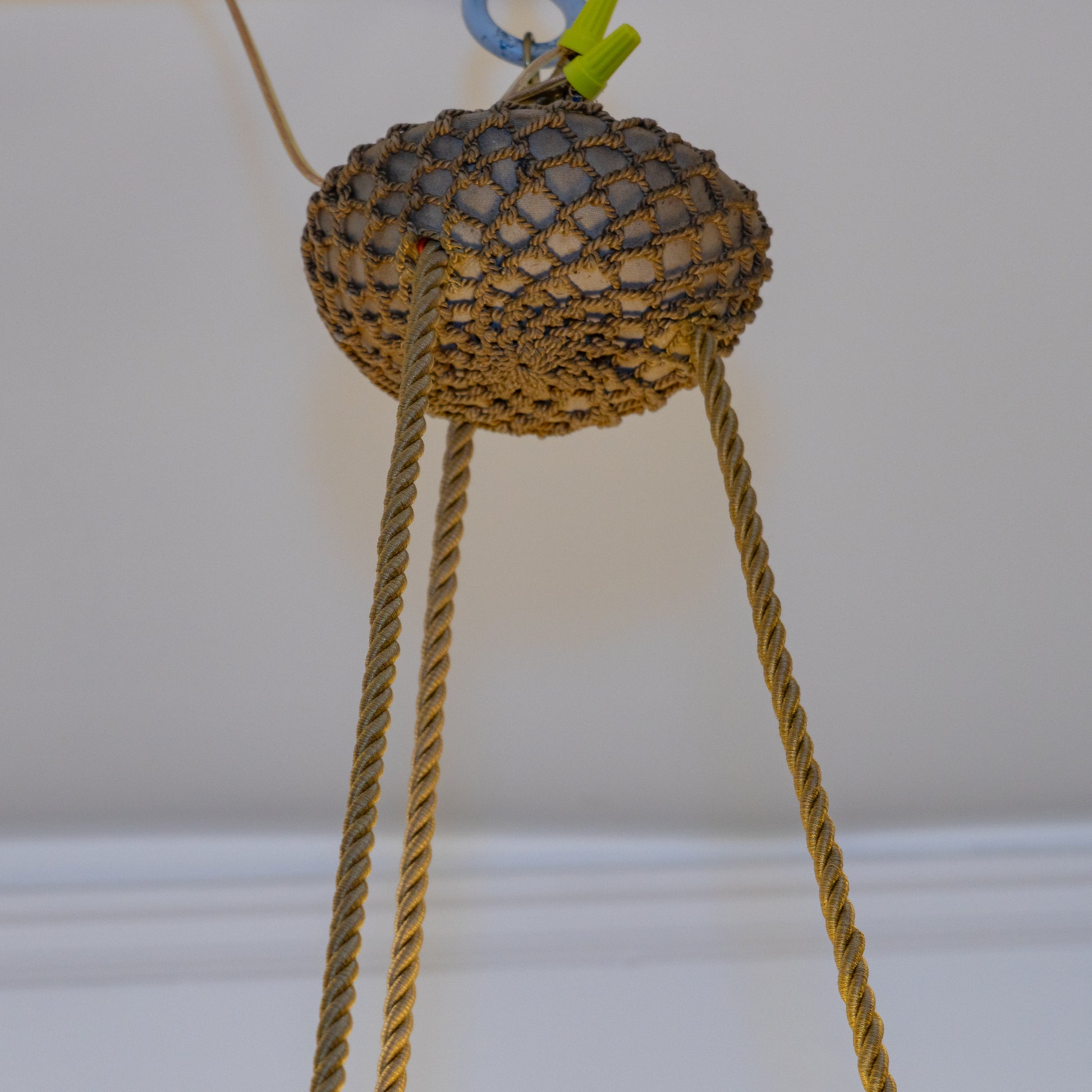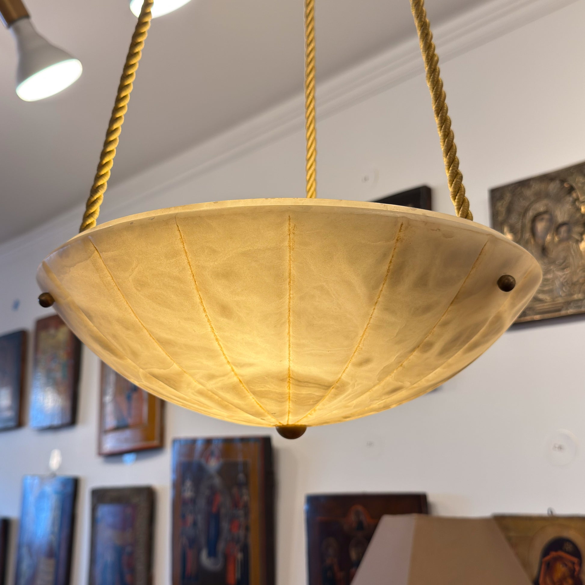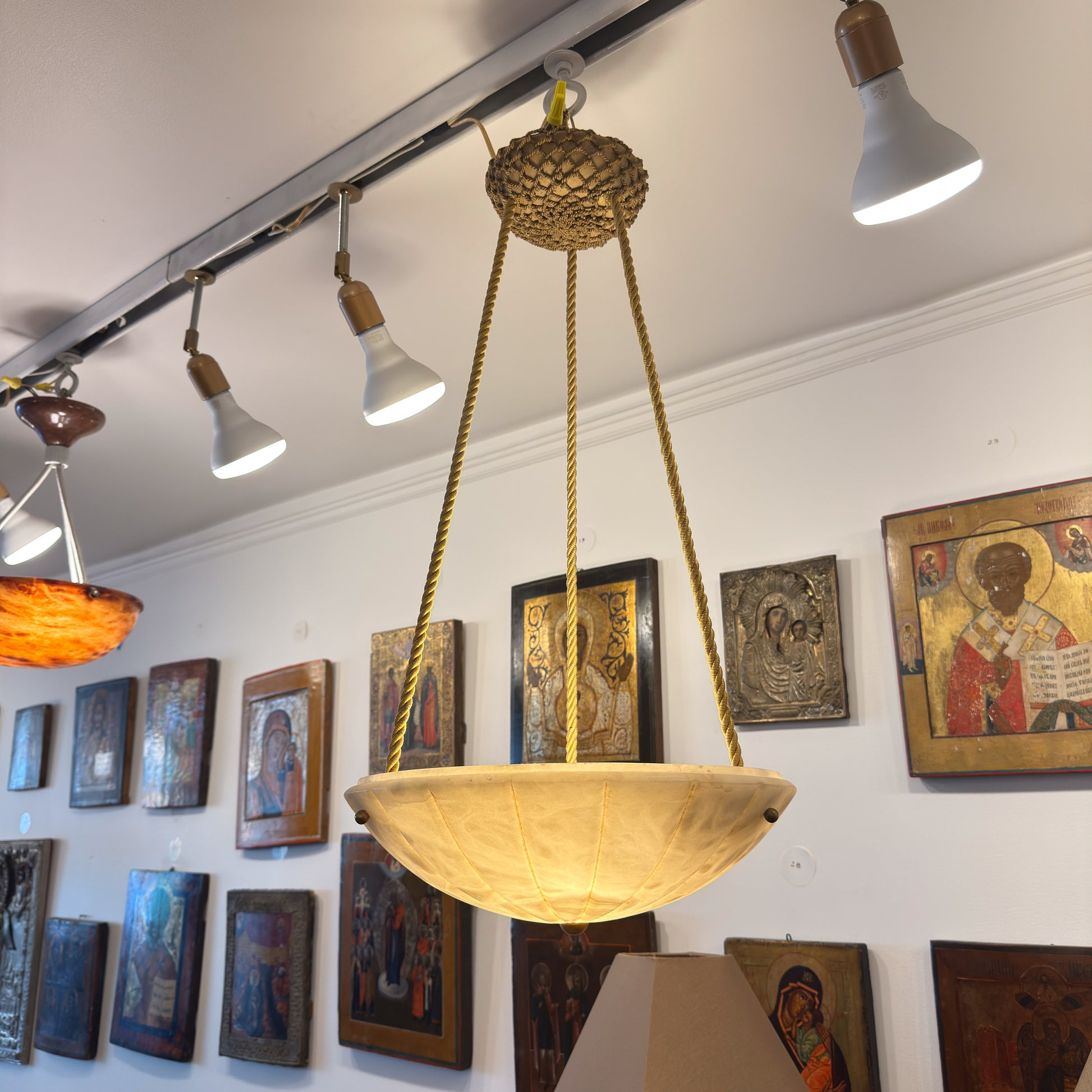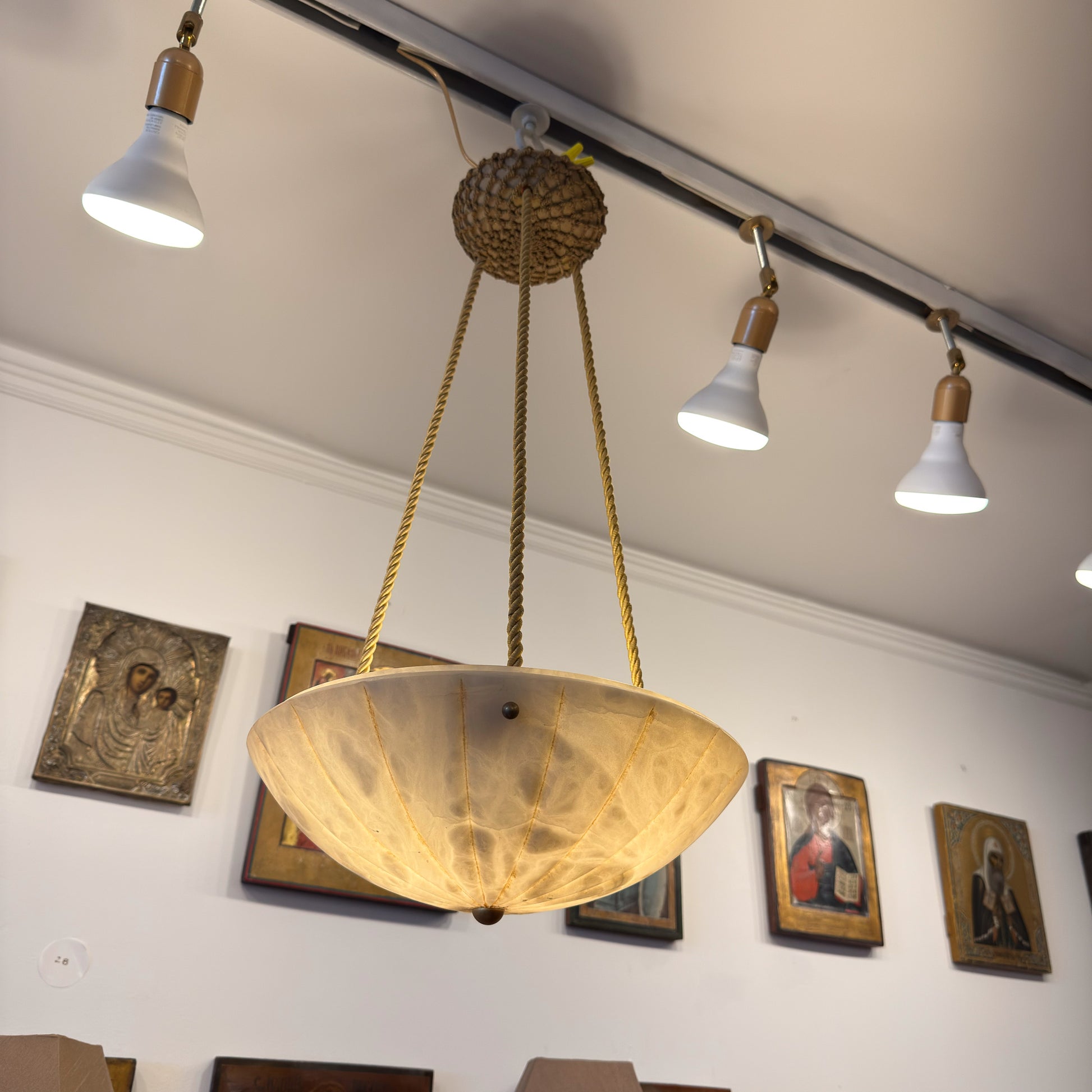 Elegant alabaster fixture with natural sandy color mineralization creating soft, diffused light. Features three dimmable 40W LED bulbs for customizable ambiance. Brass ceiling canopy topped with a delicate crocheted slip cover adds artisanal charm. Braided golden ropes and brass hardware complete this sophisticated design, perfect for entryways, dining rooms, or living spaces seeking refined, warm illumination.