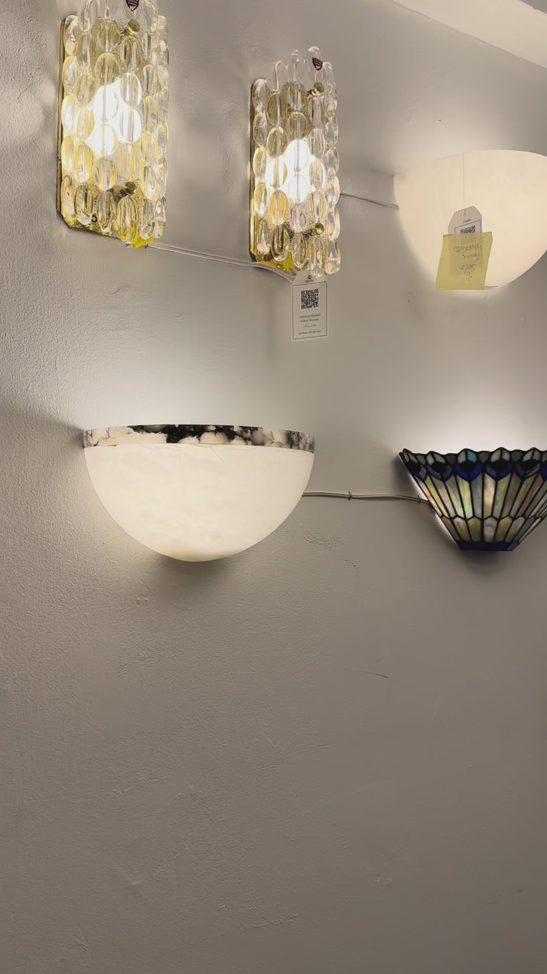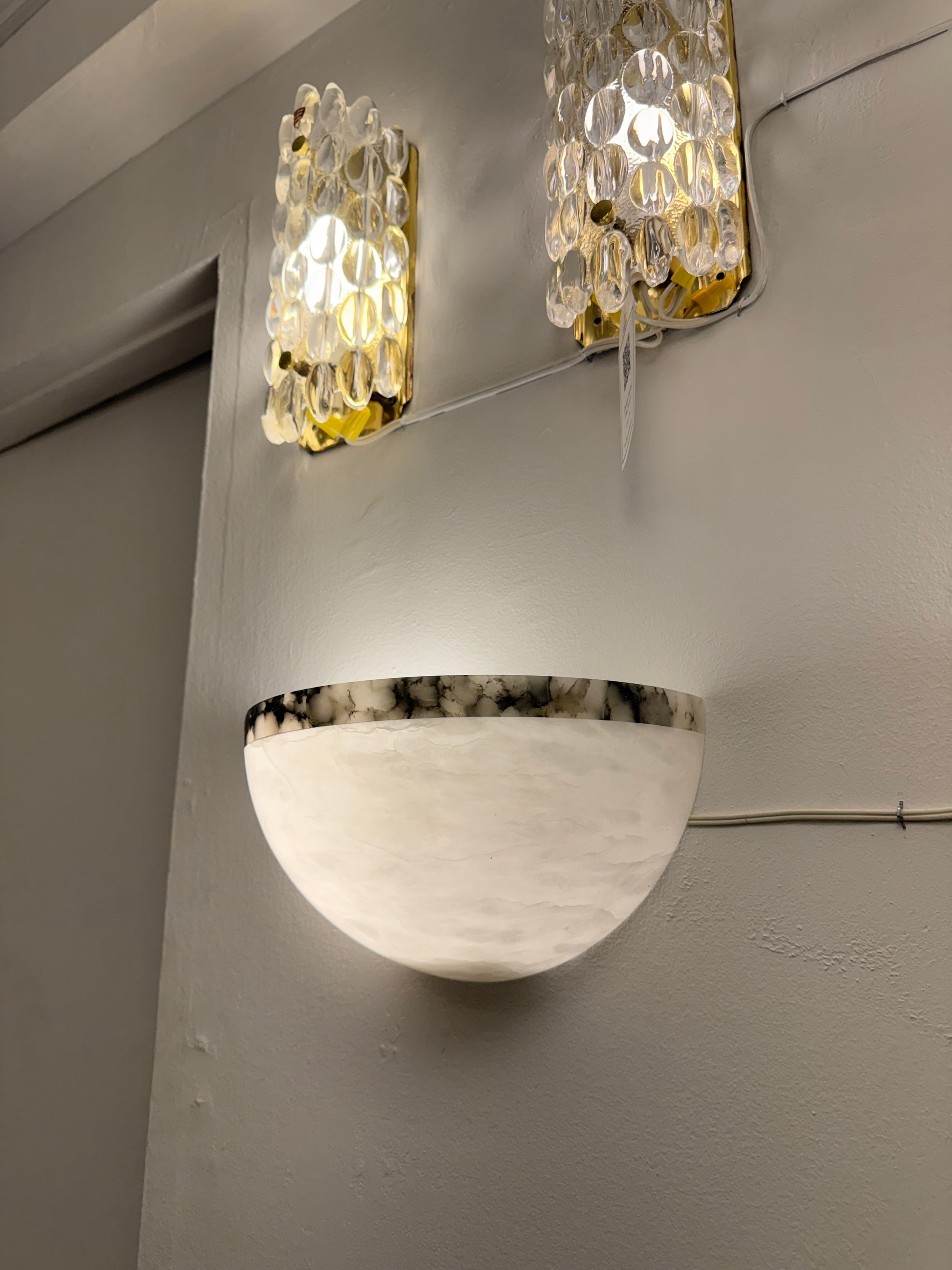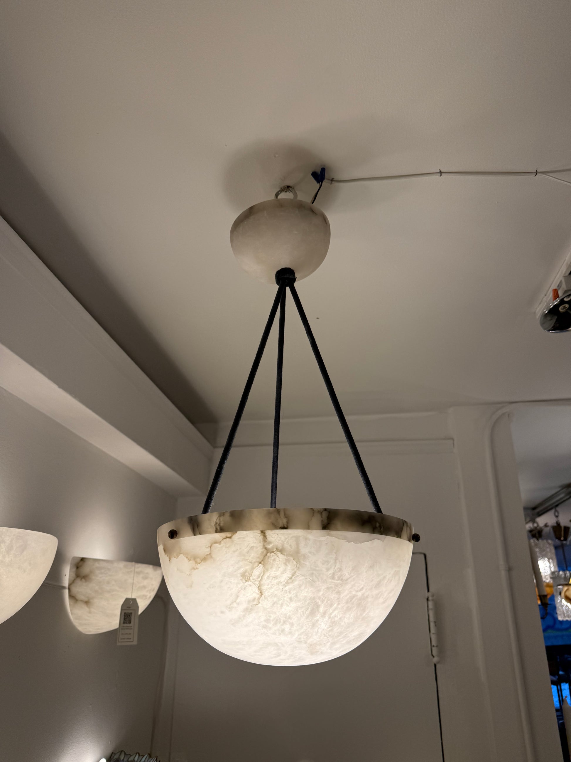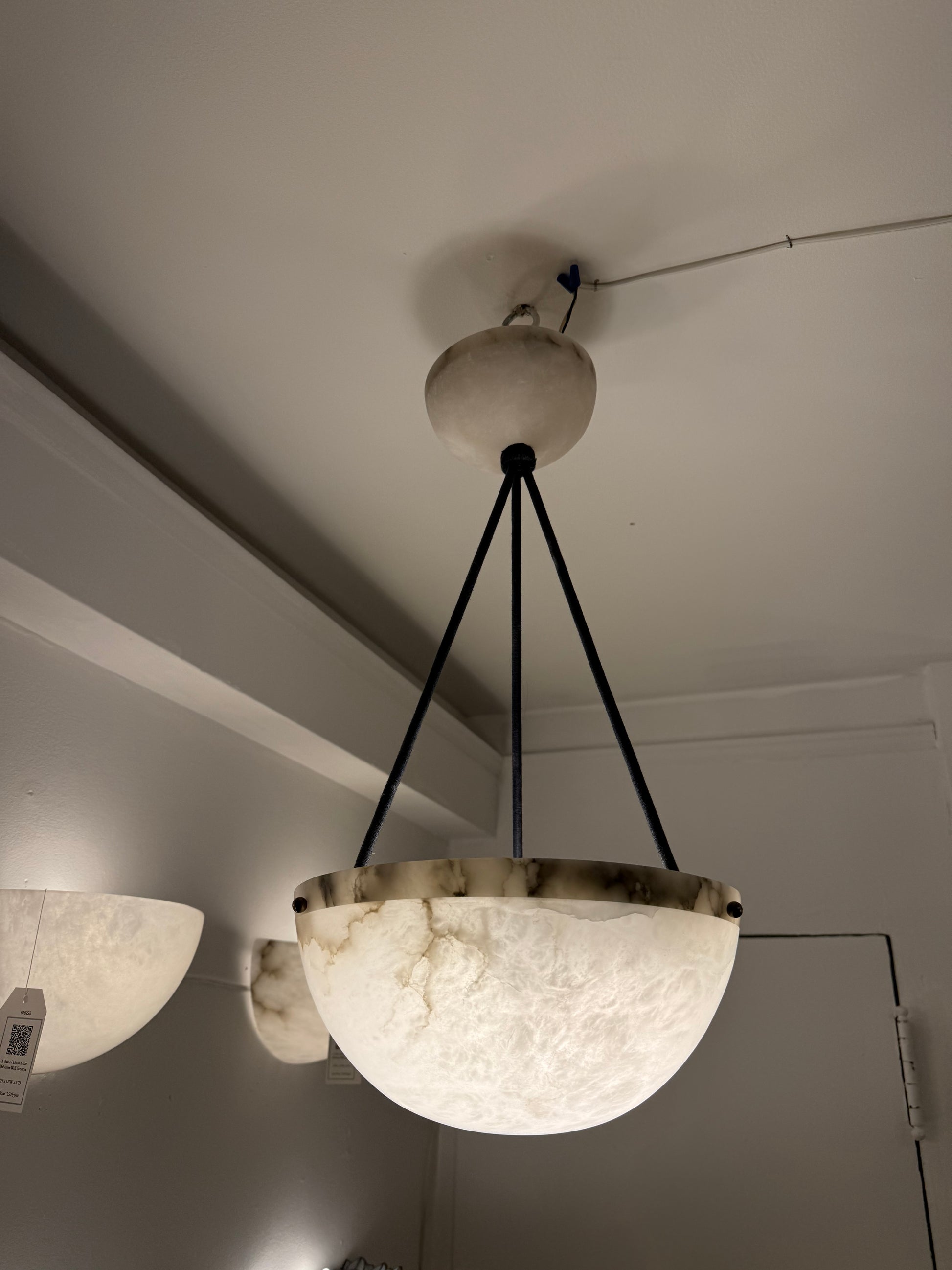 An alabaster pendant and accompanying sconce. White fossilized stone bowls are headlined with a 3/4” grey alabaster band.