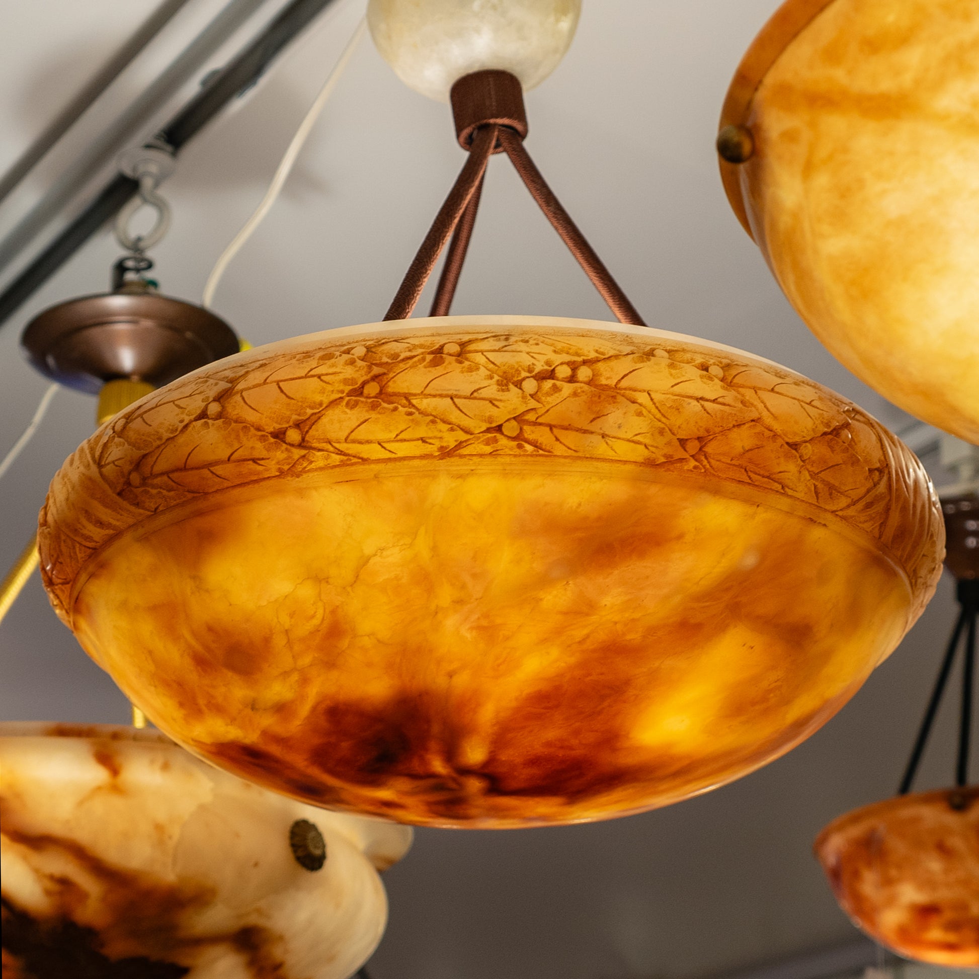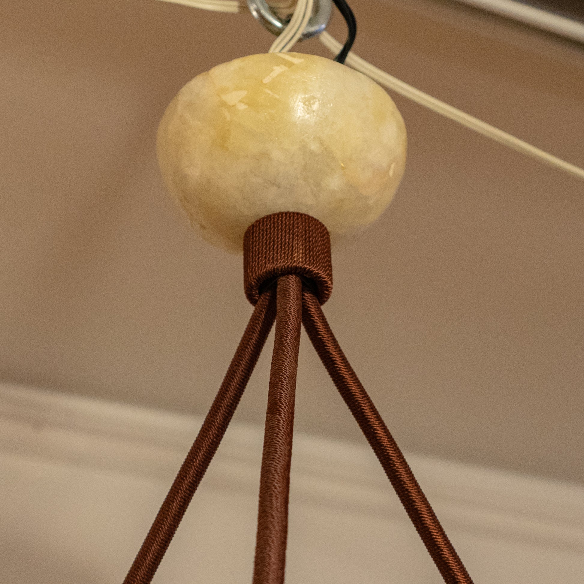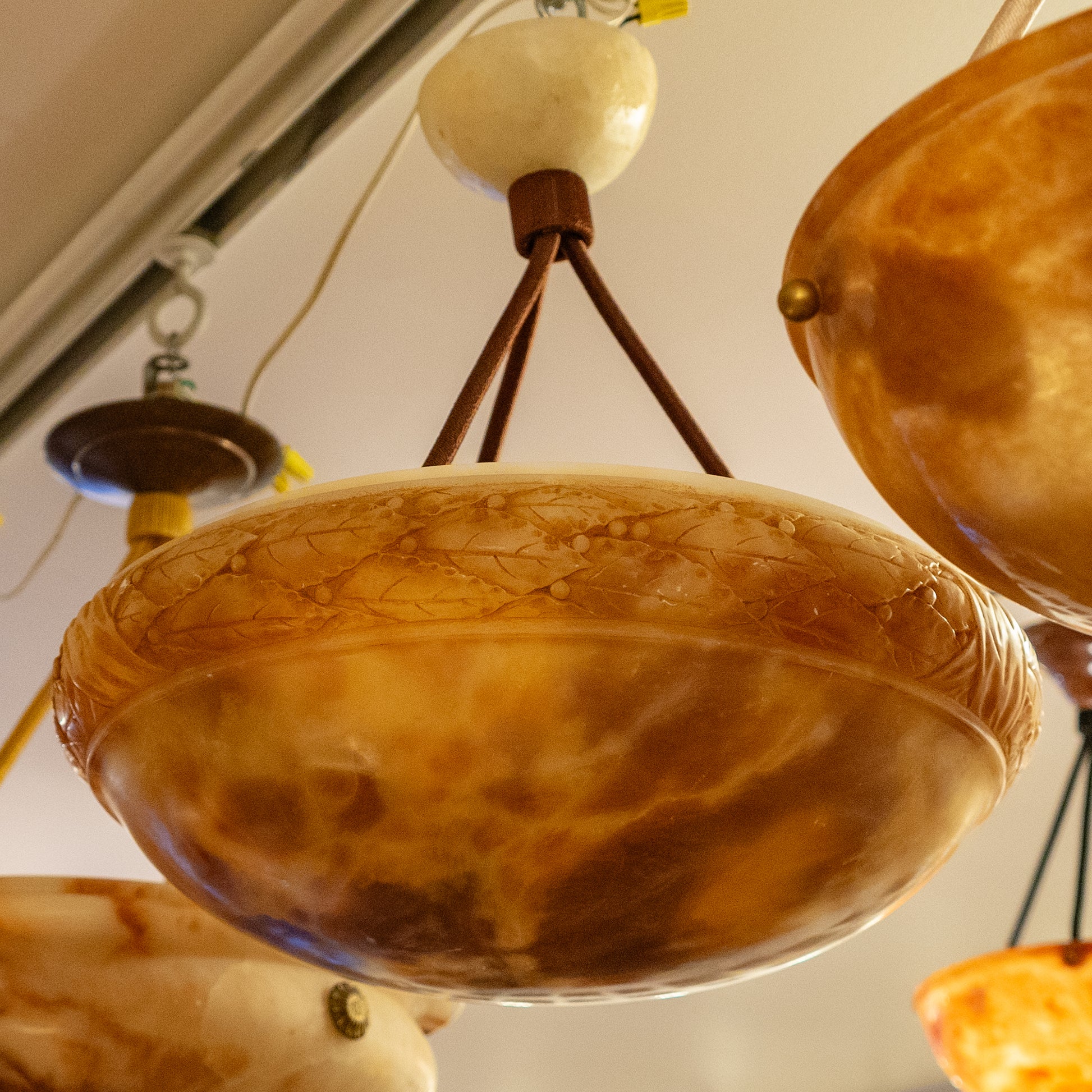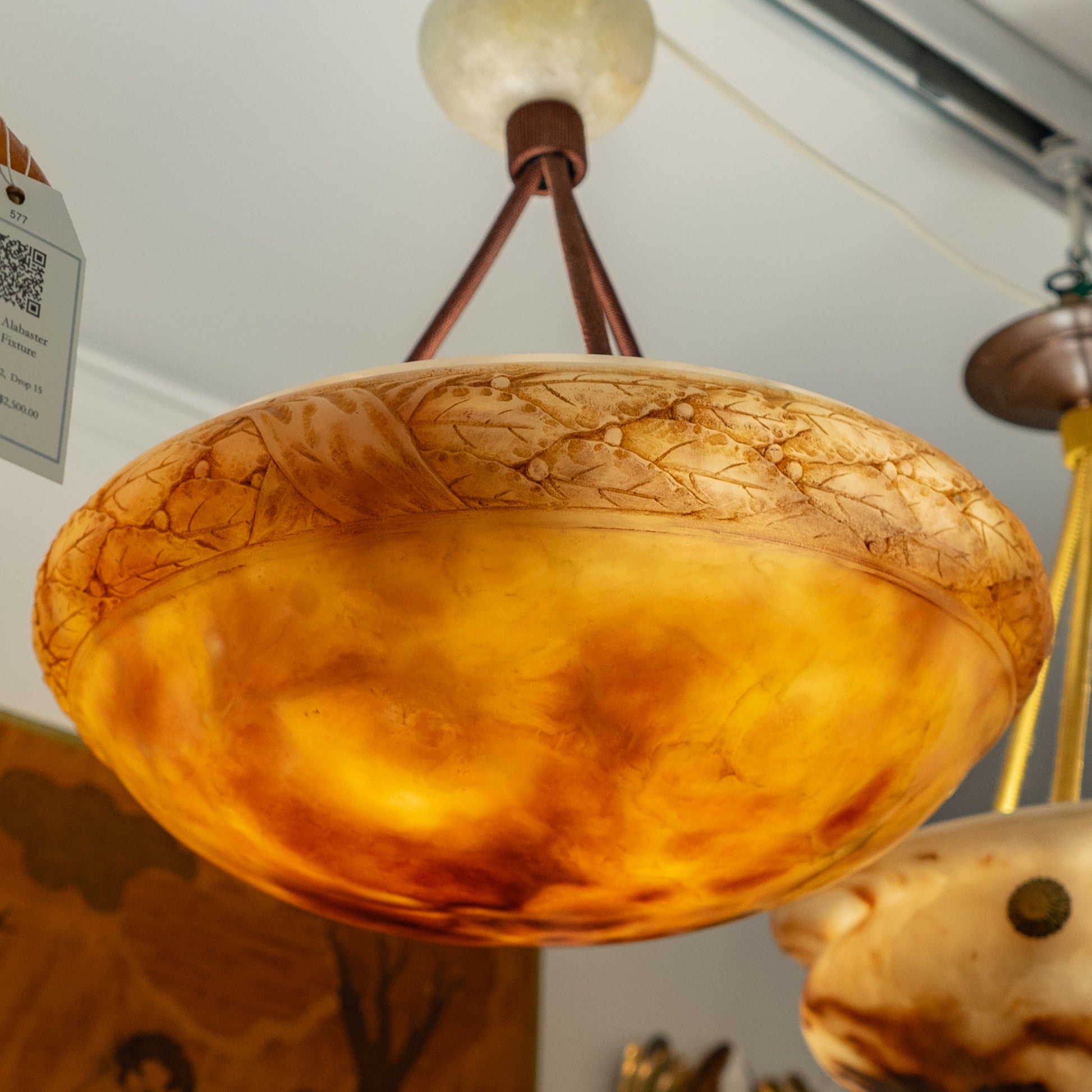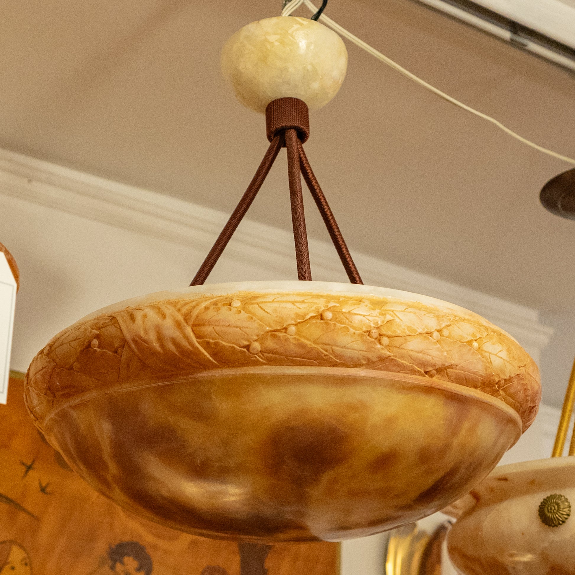 Warm amber tones interplay with a confident ring of carved laurel leaves. Mineralization is featured throughout this alabaster stone fixture, adding depth and warmth to the light as it diffuses from three standard size 60W dimmable light bulbs which are included. A custom rewiring to any drop and rope color is also included in the purchase price.