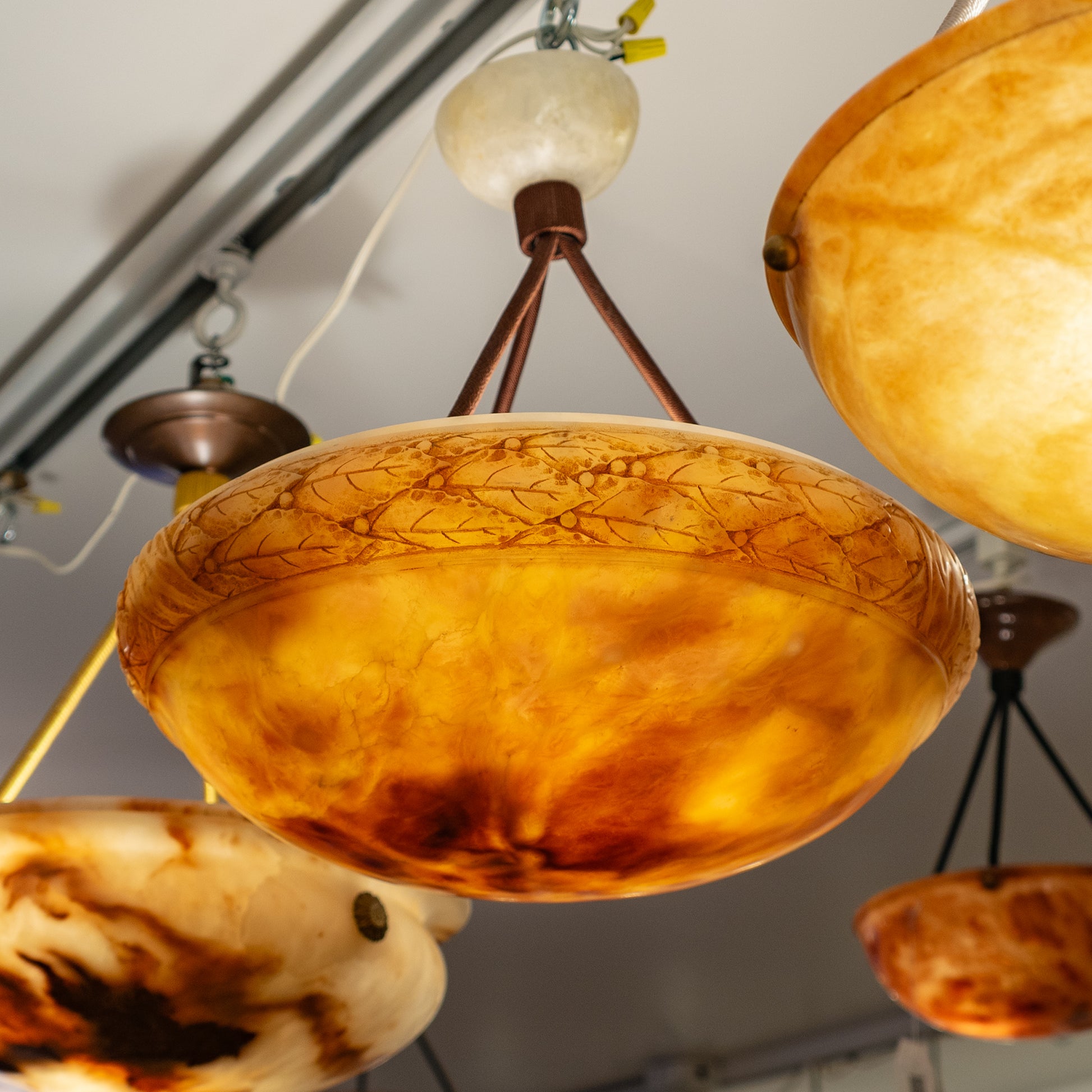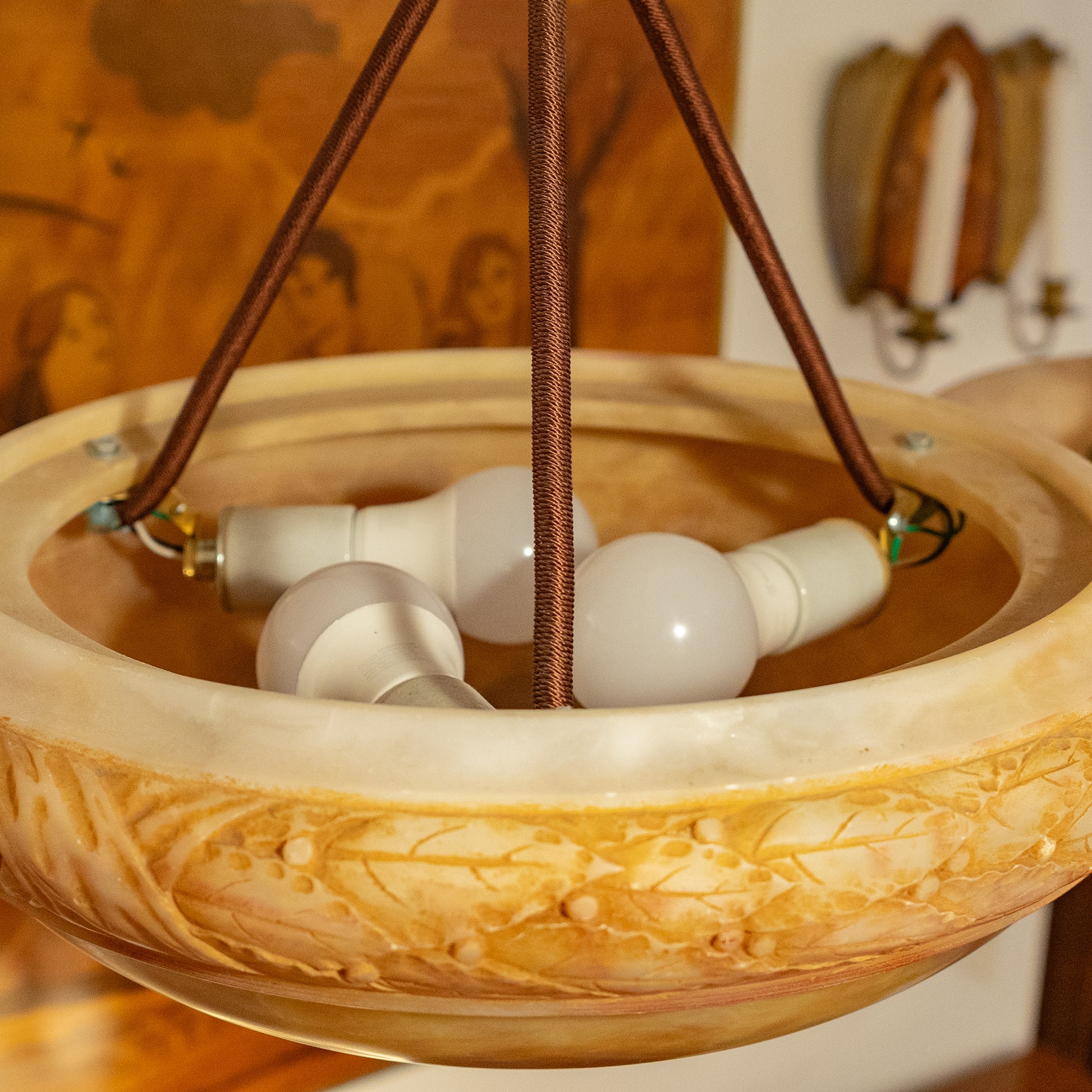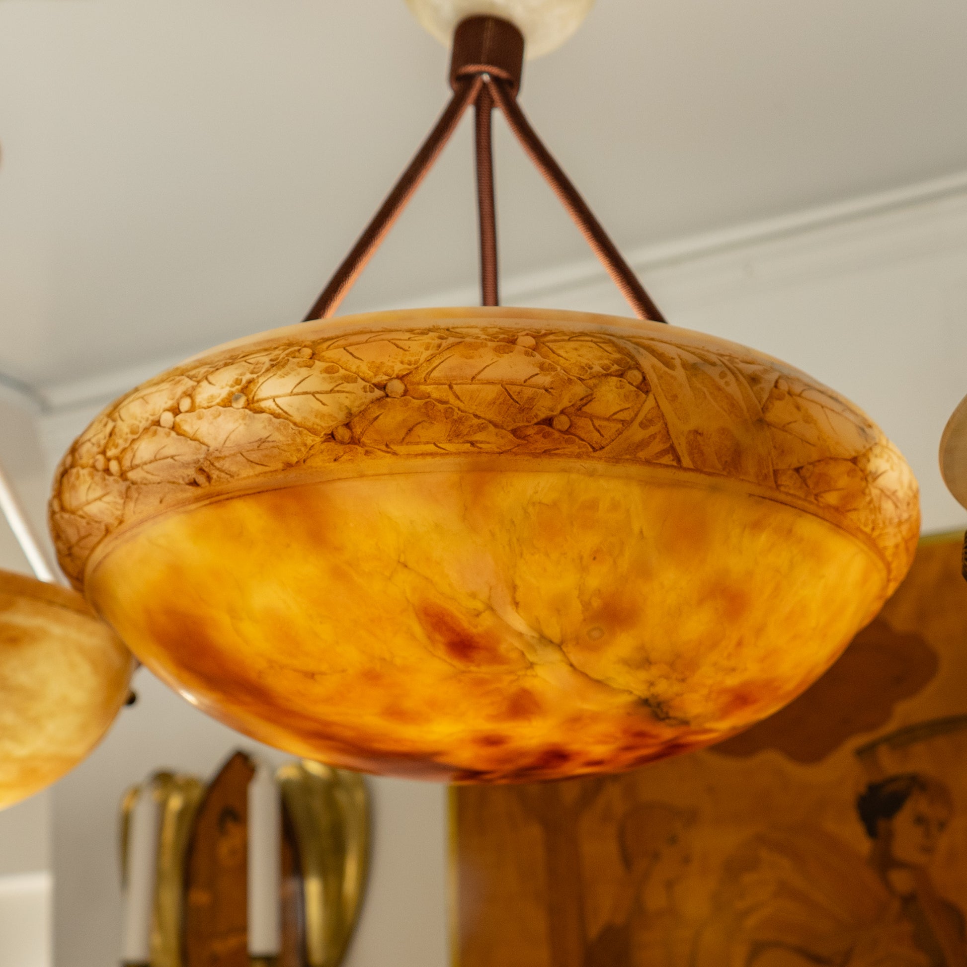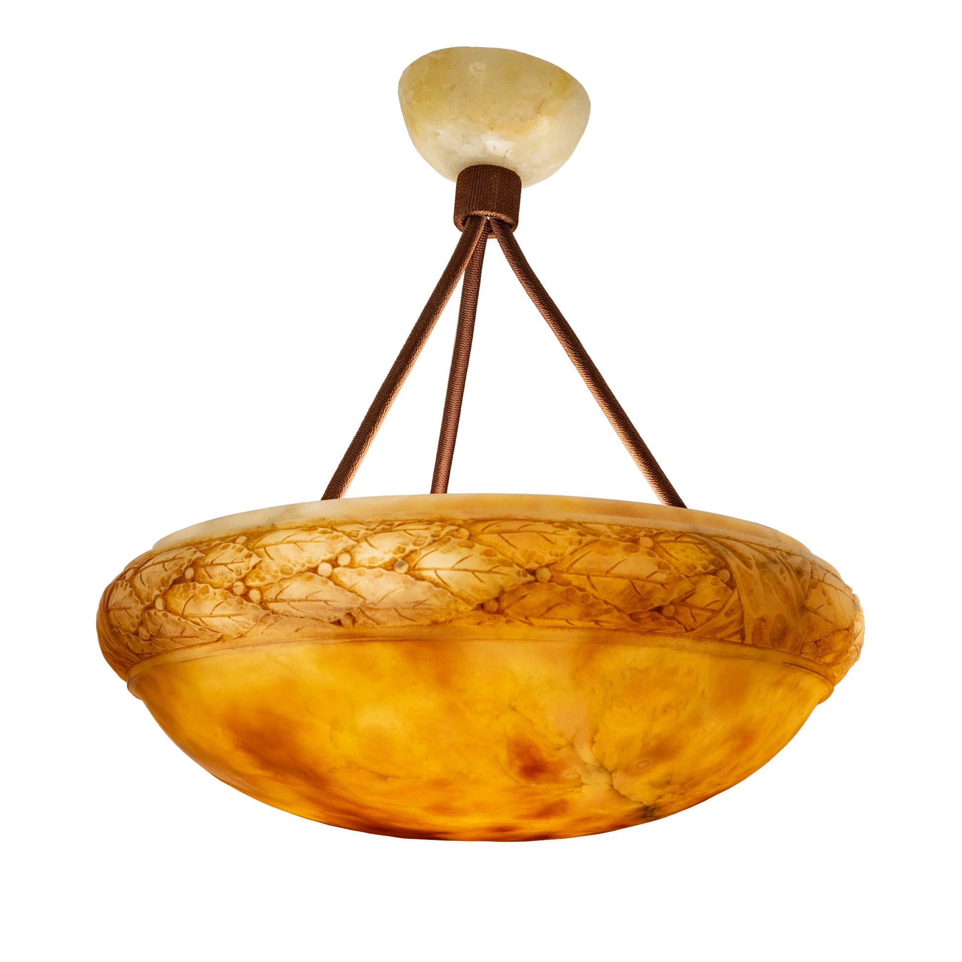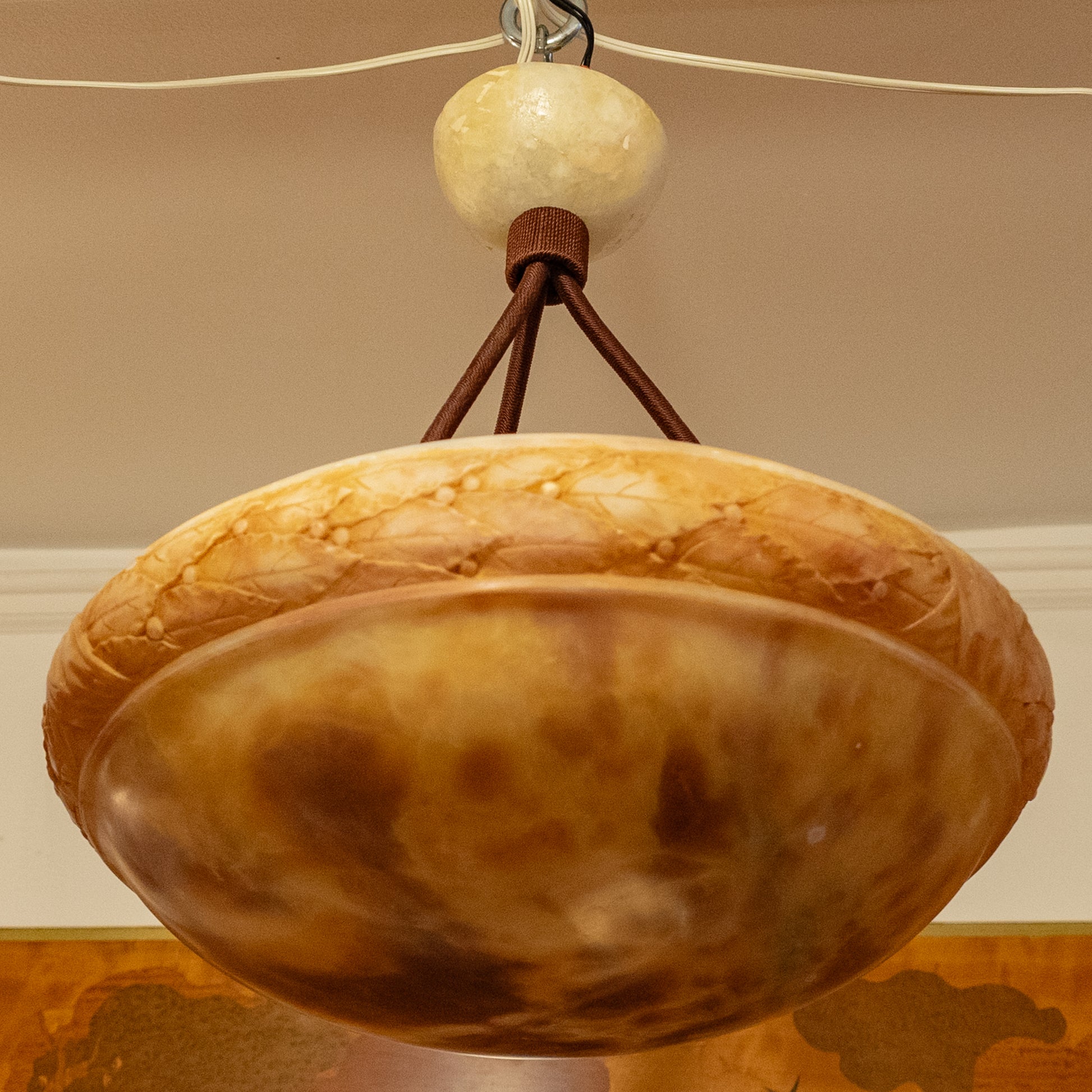 Warm amber tones interplay with a confident ring of carved laurel leaves. Mineralization is featured throughout this alabaster stone fixture, adding depth and warmth to the light as it diffuses from three standard size 60W dimmable light bulbs which are included. A custom rewiring to any drop and rope color is also included in the purchase price.