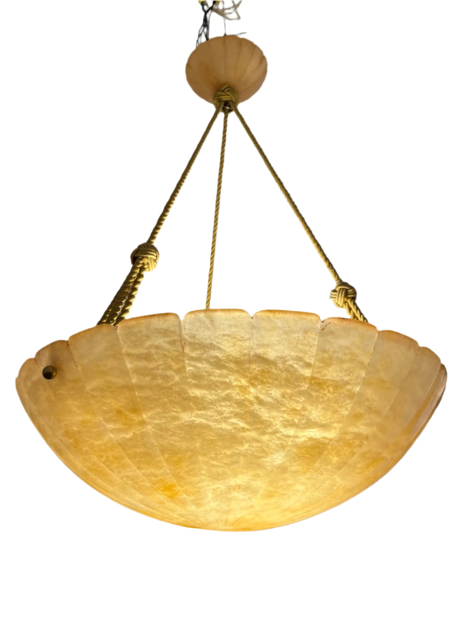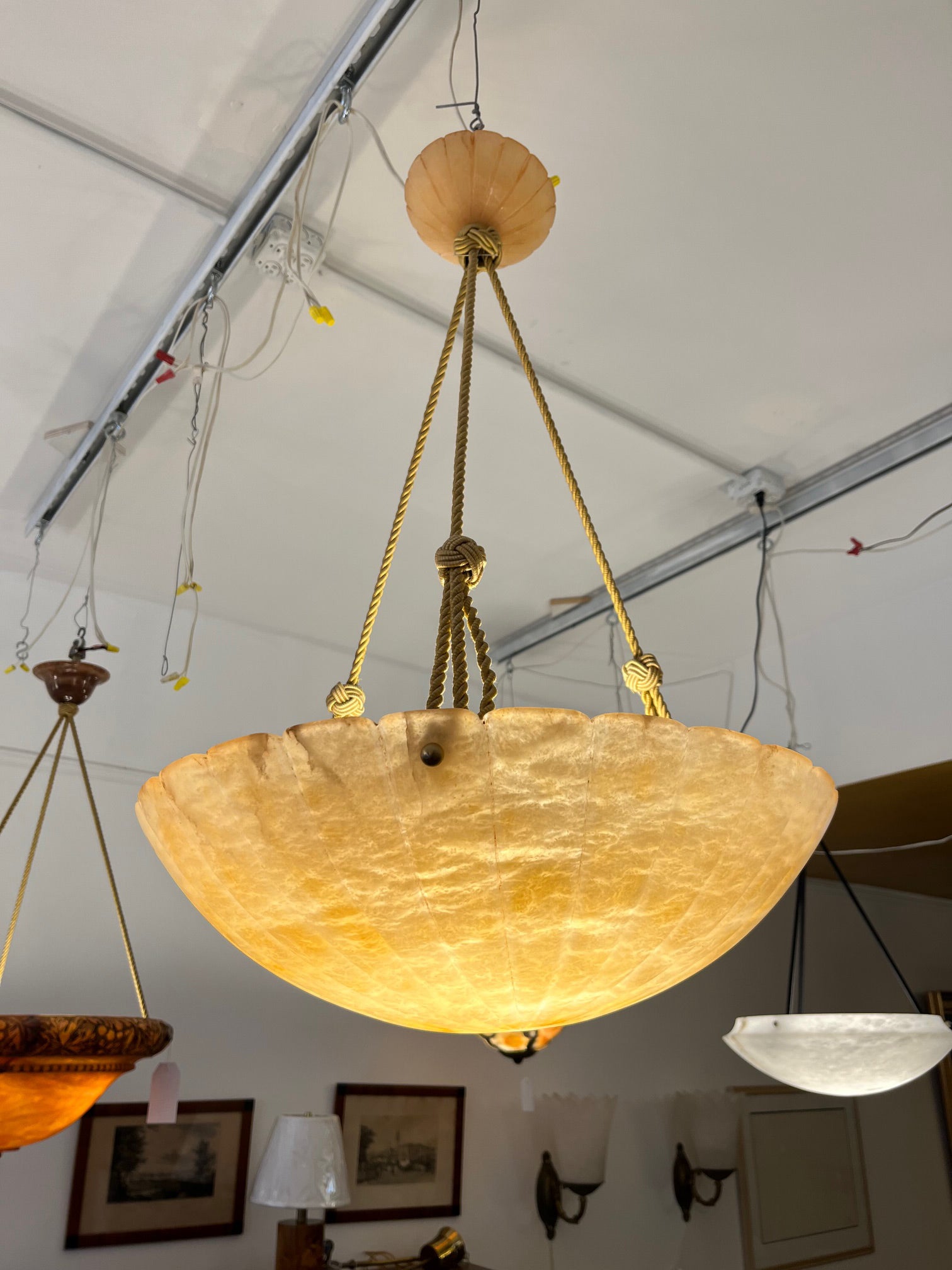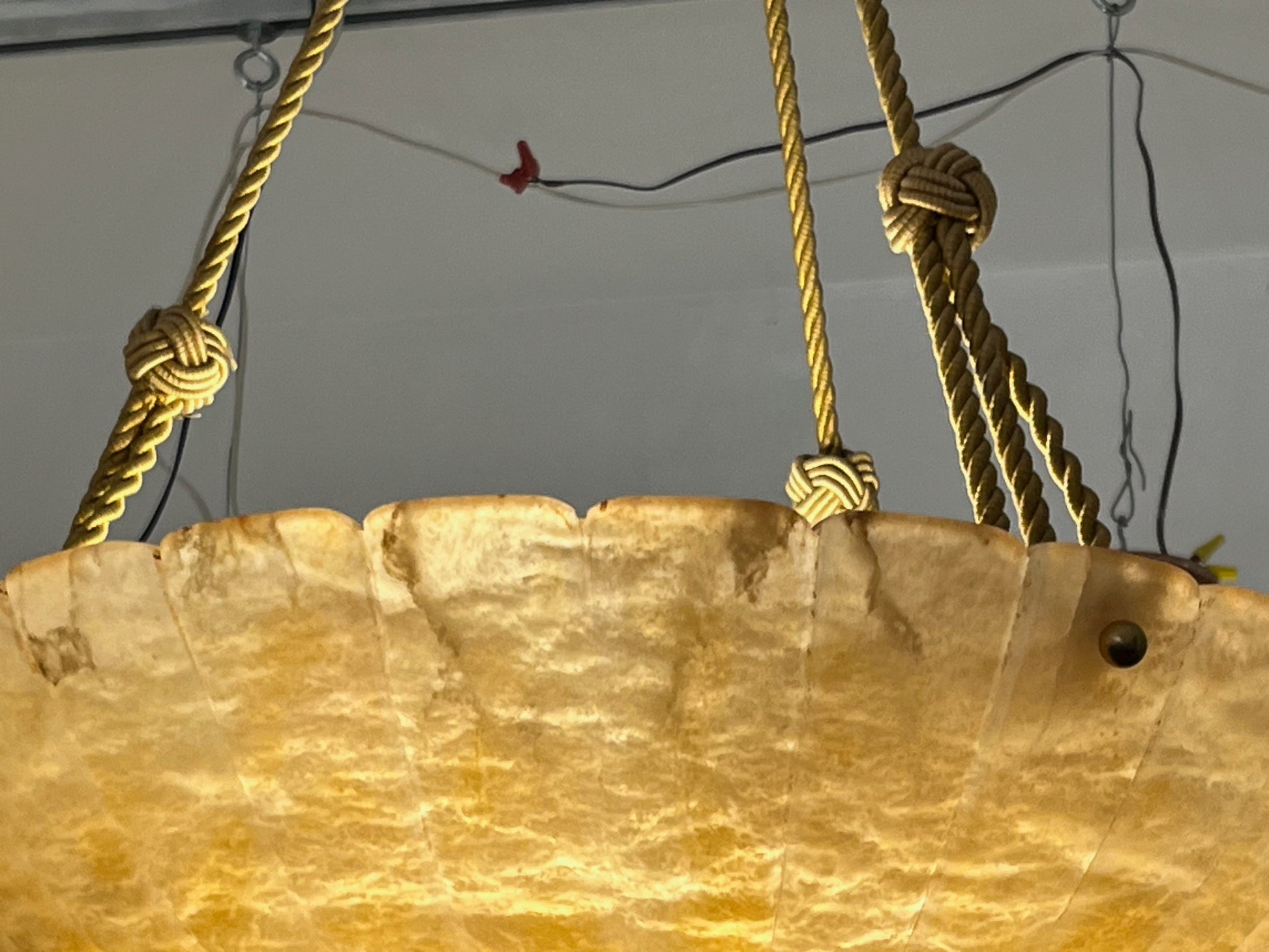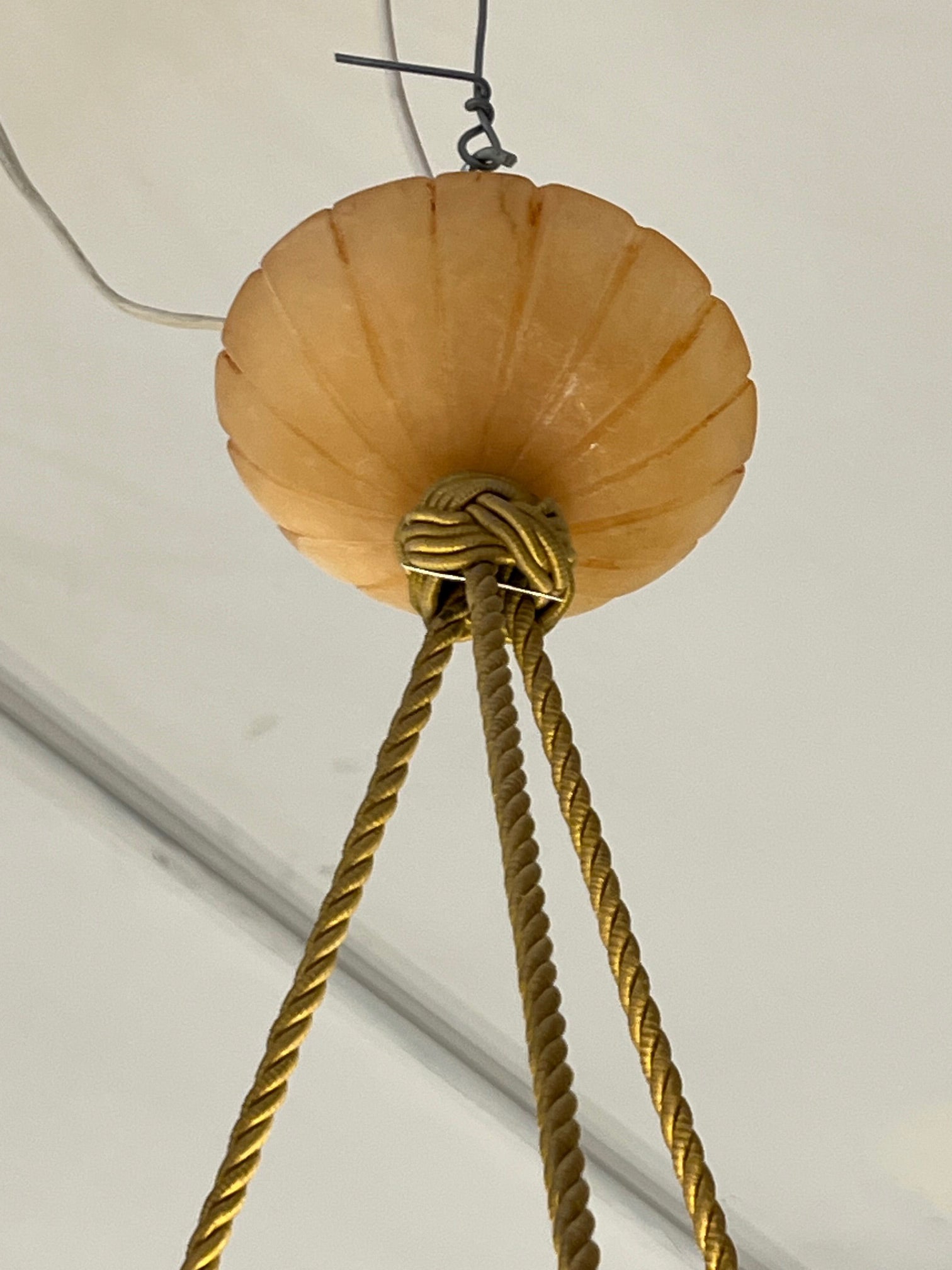 The fixture includes a matching alabaster canopy, ensuring a seamless and elegant look from top to bottom. It comes with three soft white, dimmable bulbs, allowing you to tailor the lighting to suit any mood or occasion. Additionally, a custom-made rope set, crafted precisely to meet your specifications, is included, offering both functionality and a personalized touch to the installation.