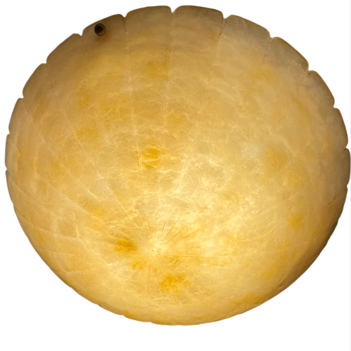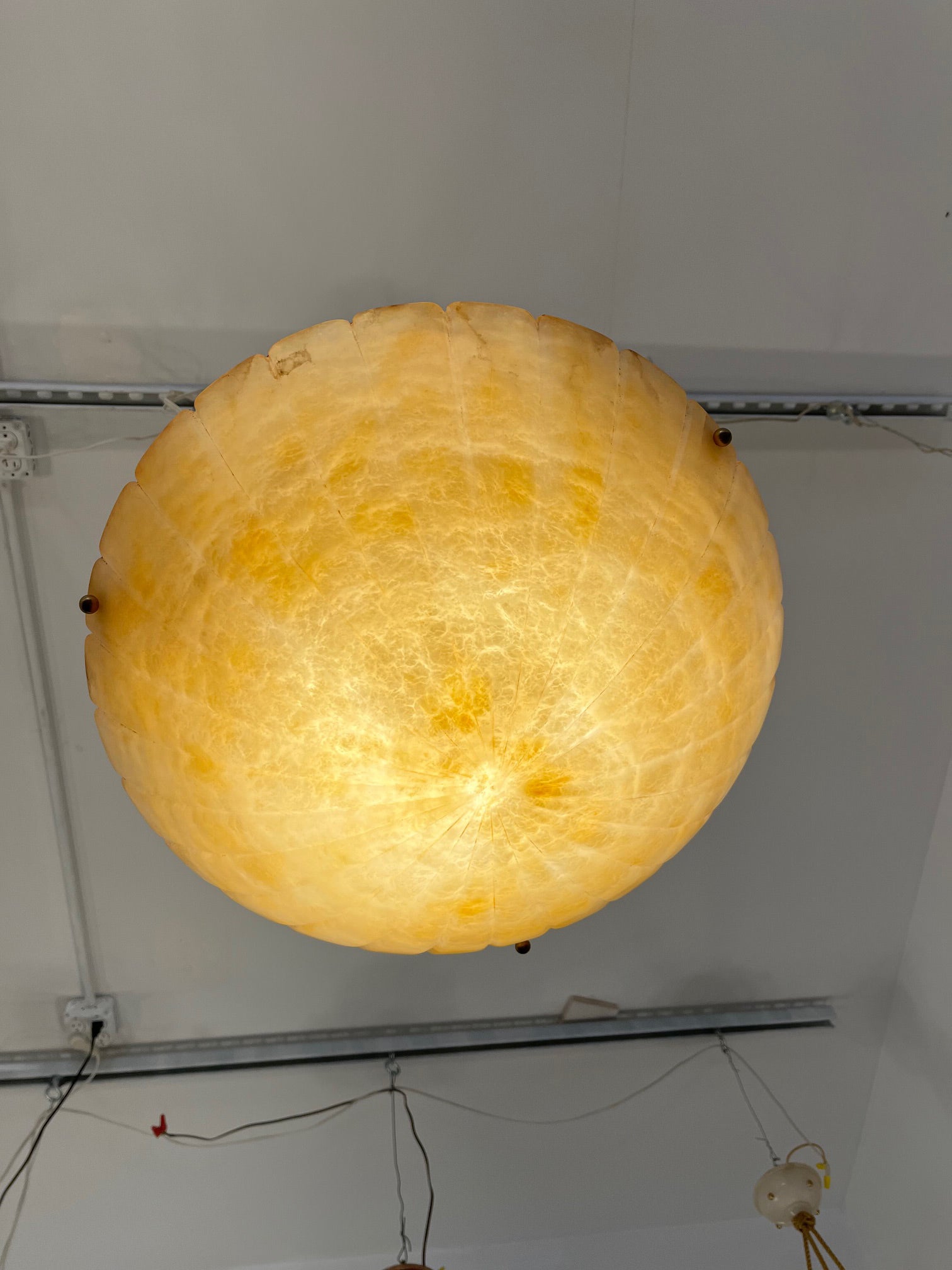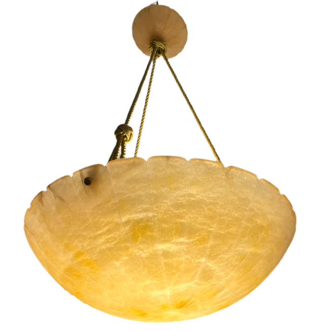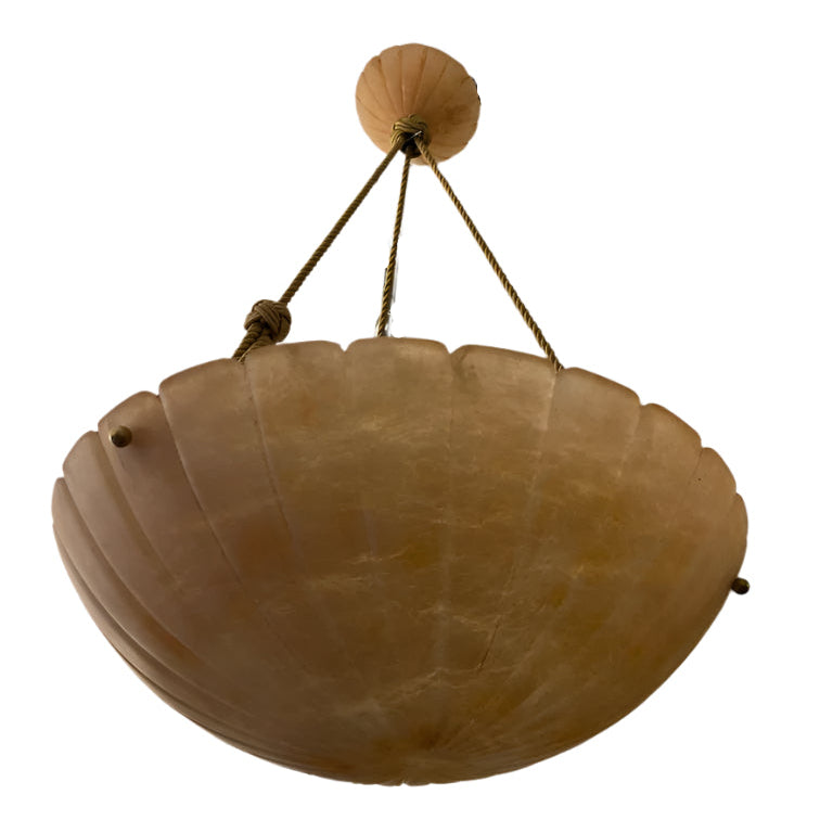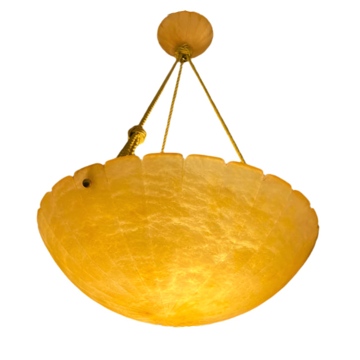Enhance your space with this stunning period light fixture, expertly carved from a single block of amber alabaster stone. This exceptional piece features a bowl with a depth of 8 inches, a diameter of 20 inches, and an overall drop of 20 inches, making it a substantial and eye-catching addition to any room. The alabaster's delicate mineralization softly illuminates, casting a warm, inviting glow throughout your space.