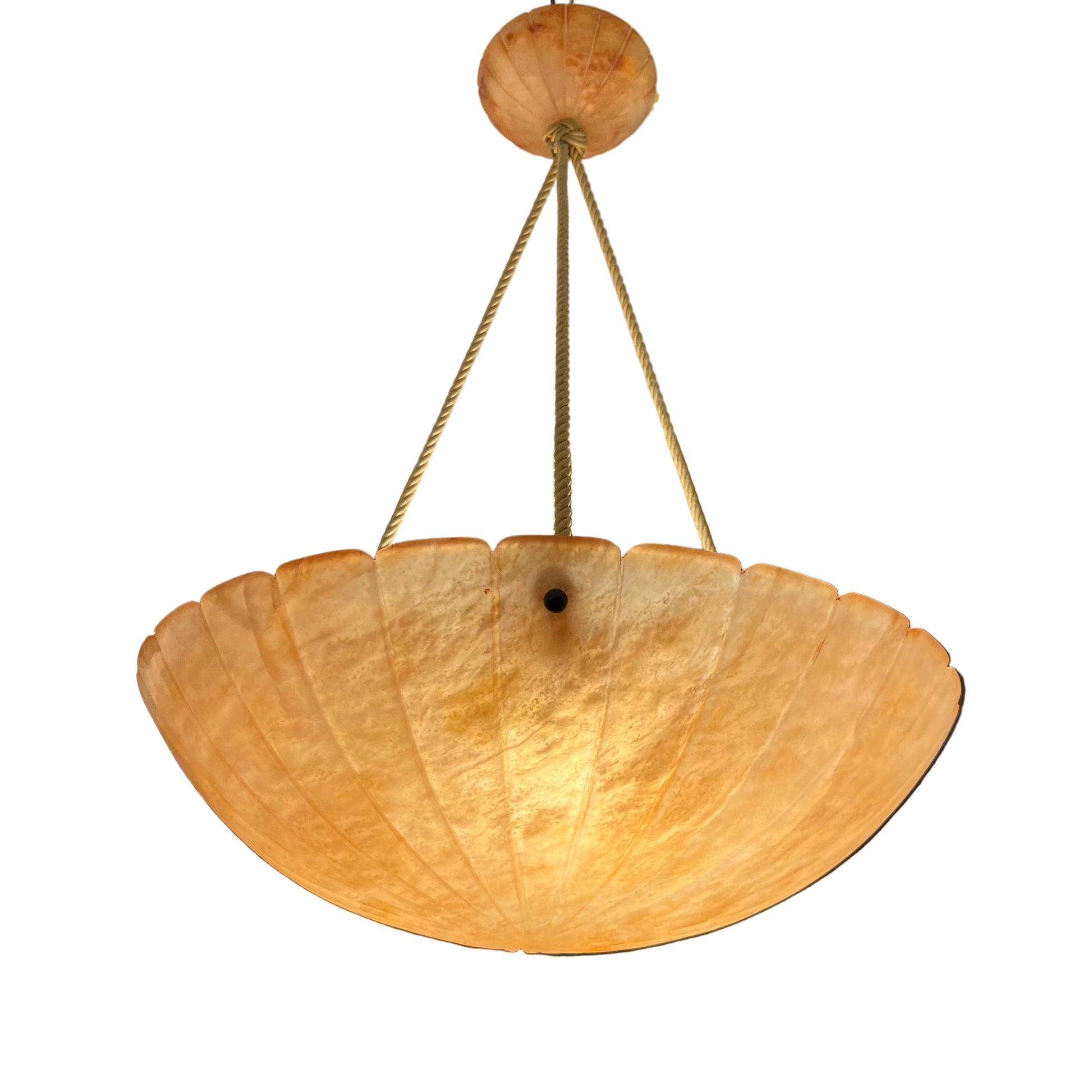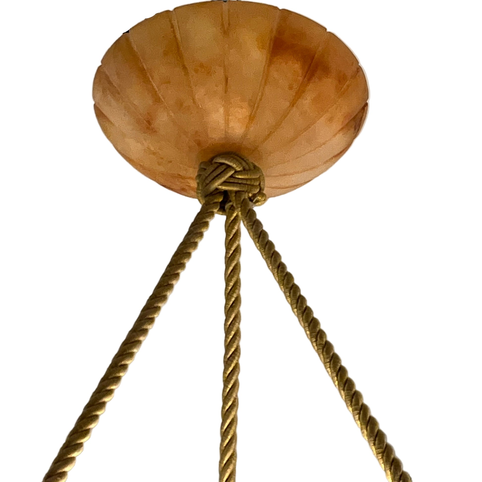 This exquisite period fixture showcases the timeless elegance of hand-carved amber alabaster, sculpted from a single pristine block. Delicate mineralization threads throughout the stone create captivating depth and movement, casting a warm, sophisticated glow that transforms any room into a gallery-worthy space. The fixture arrives complete with a matching canopy and three dimmable soft white bulbs (60W each), allowing you to set the perfect ambiance. Custom rewiring to your preferred drop length is included, ensuring a seamless installation tailored to your home's architecture. A true collector's piece that marries natural beauty with functional artistry.