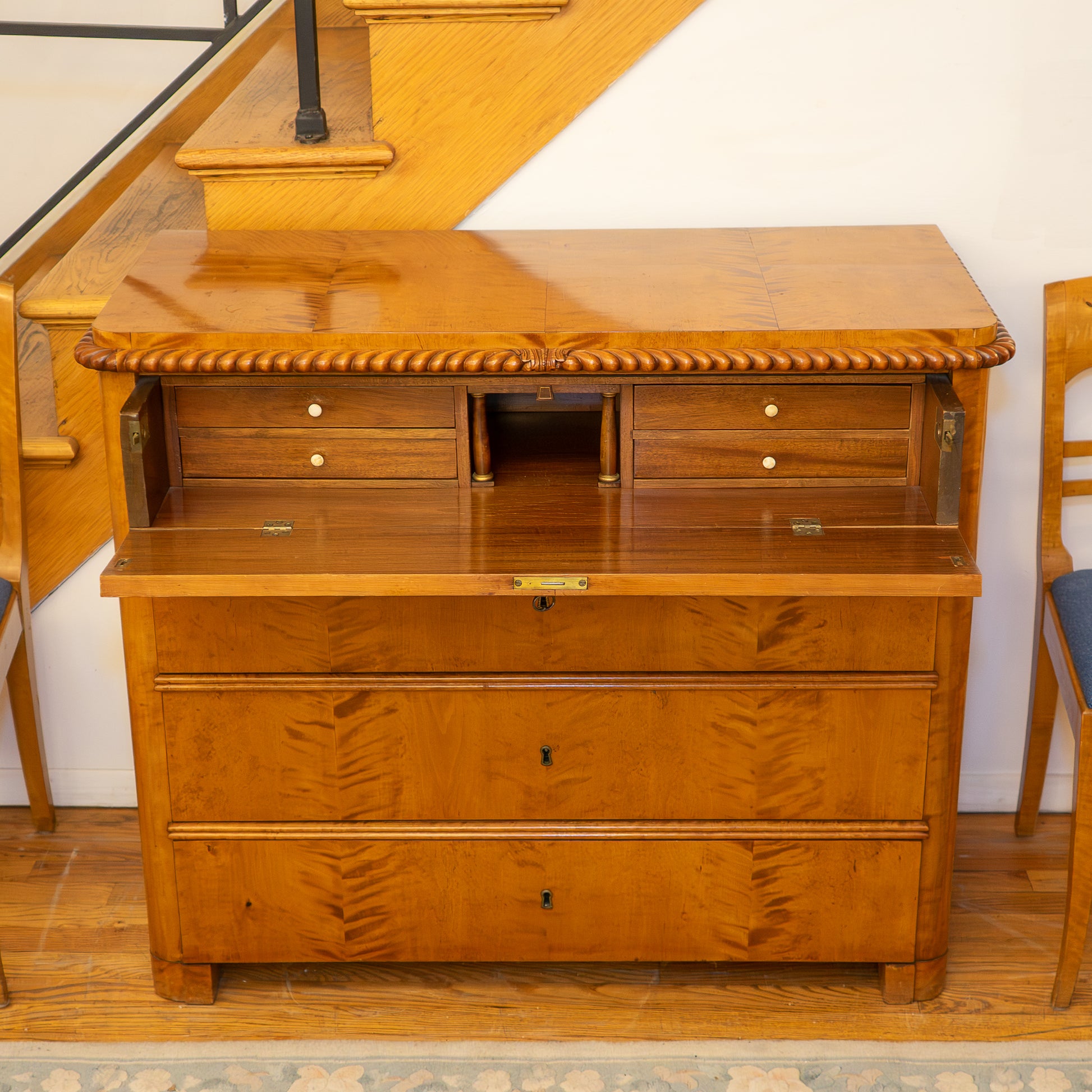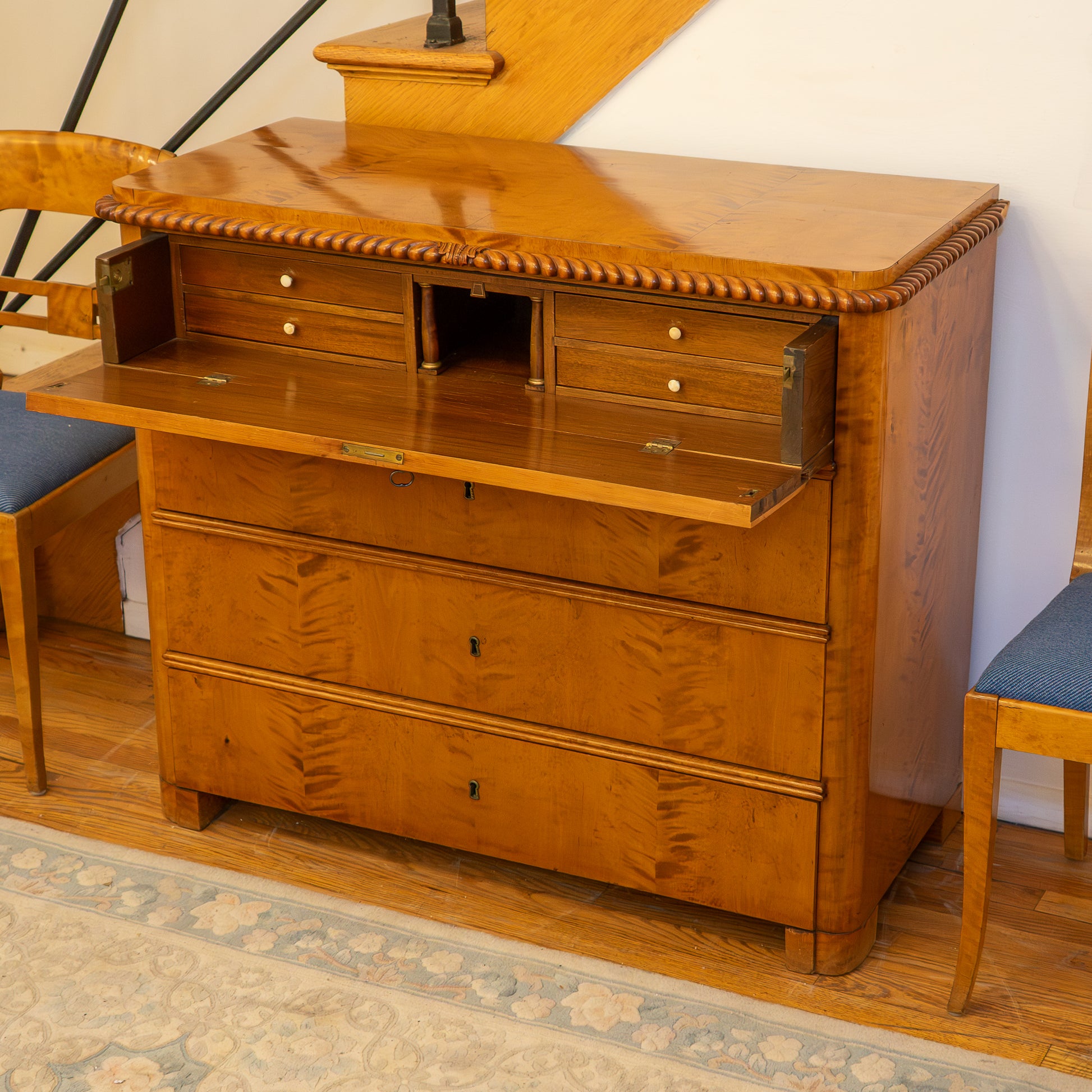 Carved ornamentation is sold birch, while all fir drawer faces and facing surfaces are veneered in highly figured birch. Brass hardware and locks are in good working condition.