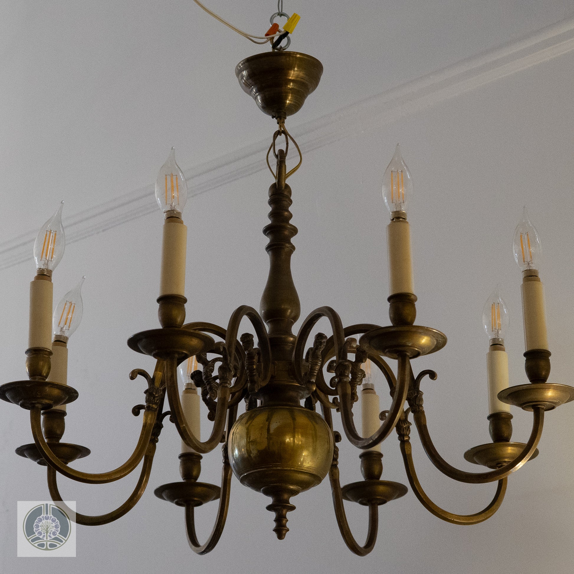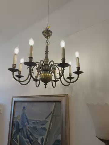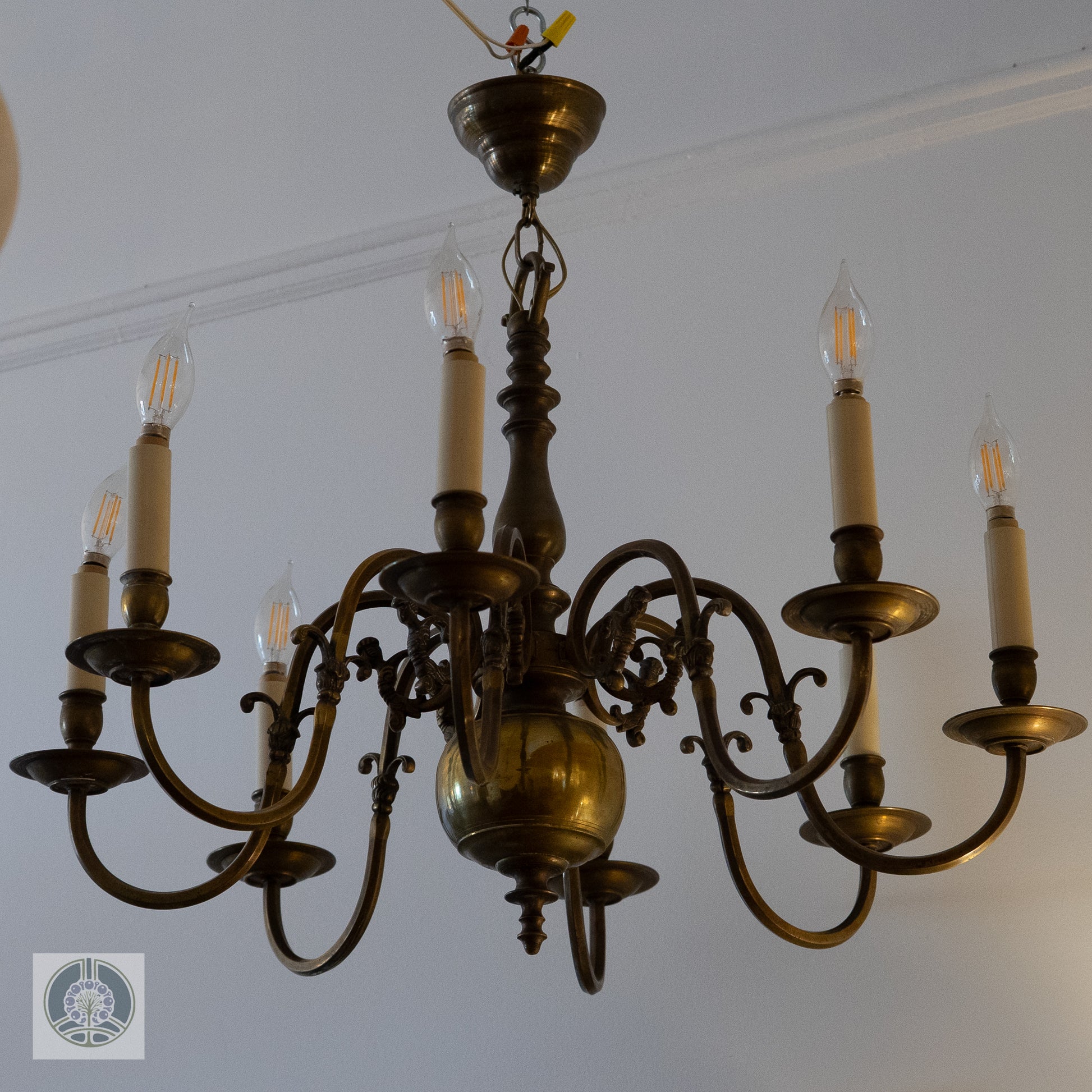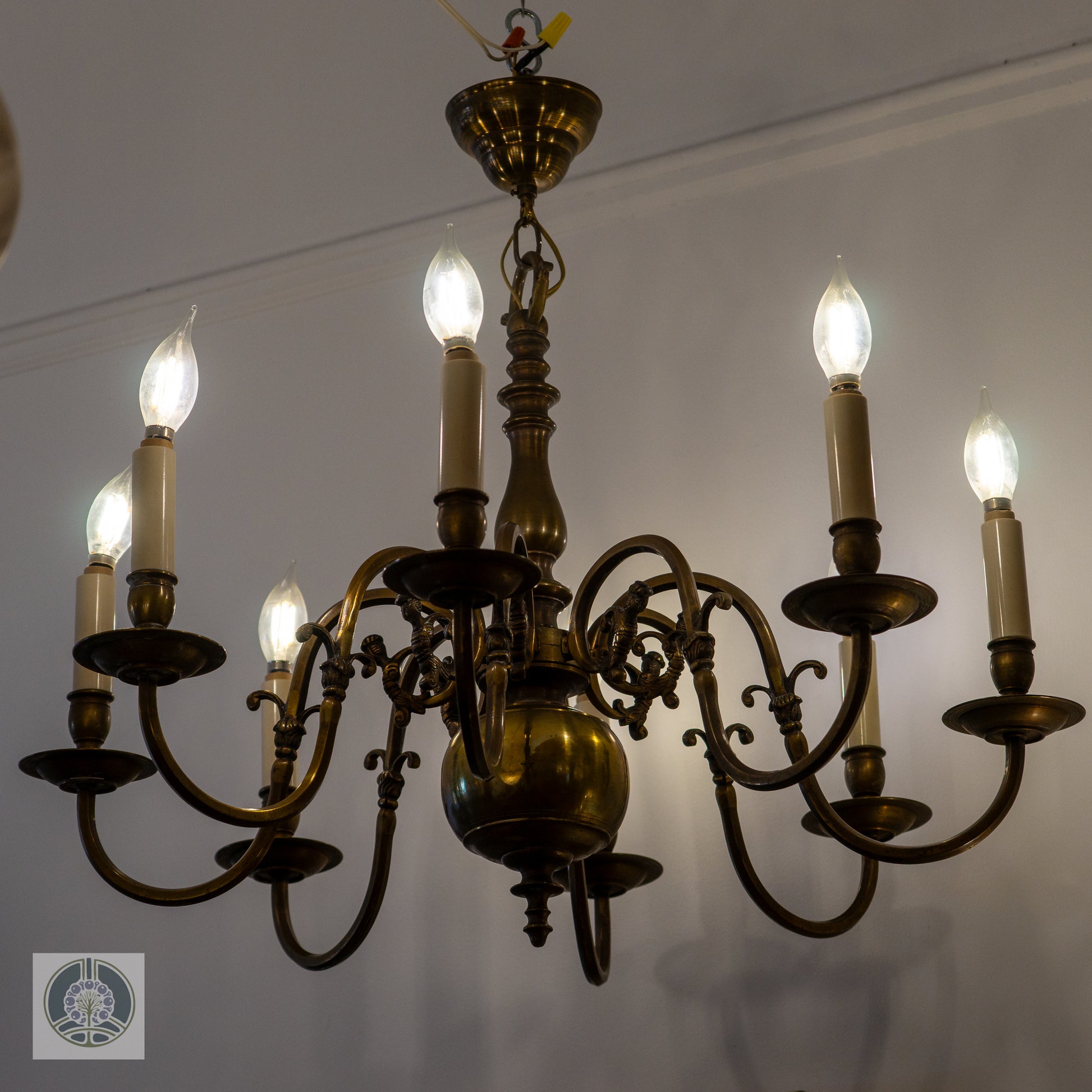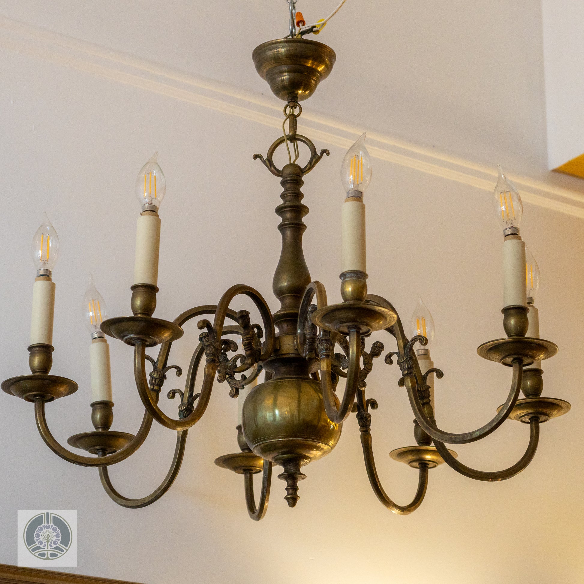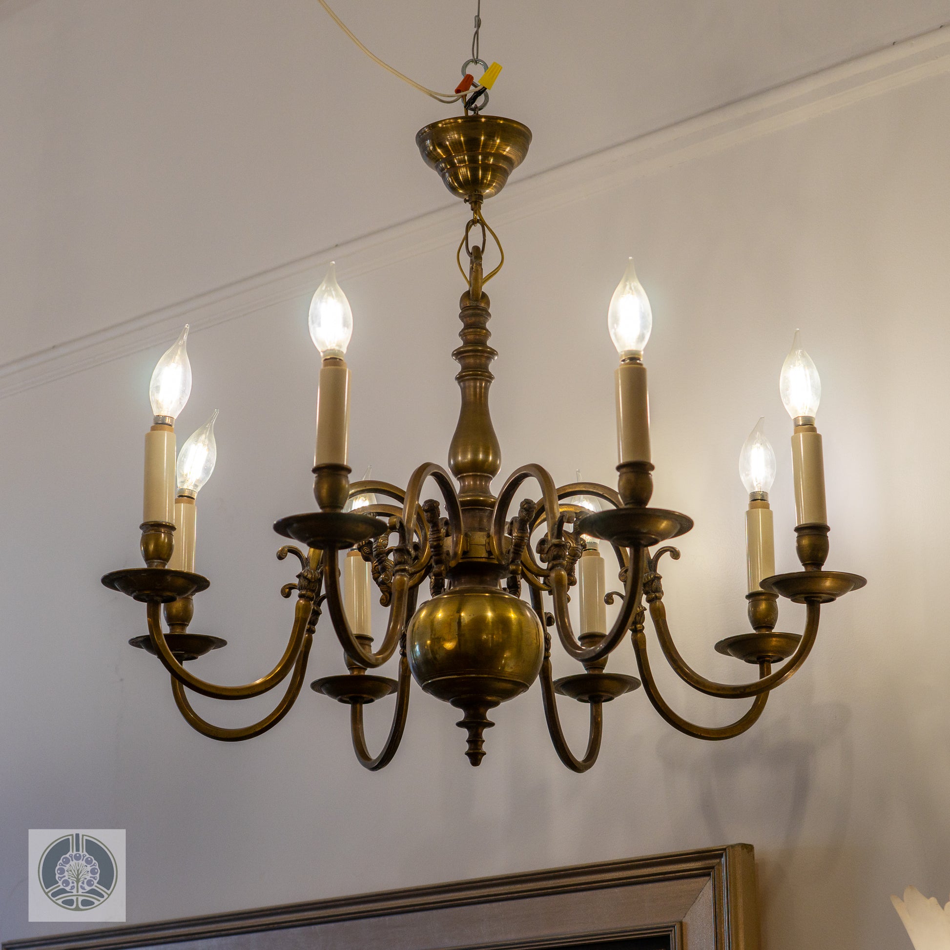 This striking antique chandelier brings timeless elegance to any room. Crafted in solid brass with a rich, aged patina, it features eight gracefully scrolled arms with candle-form lights, each set on wide bobeches for a classic silhouette.
