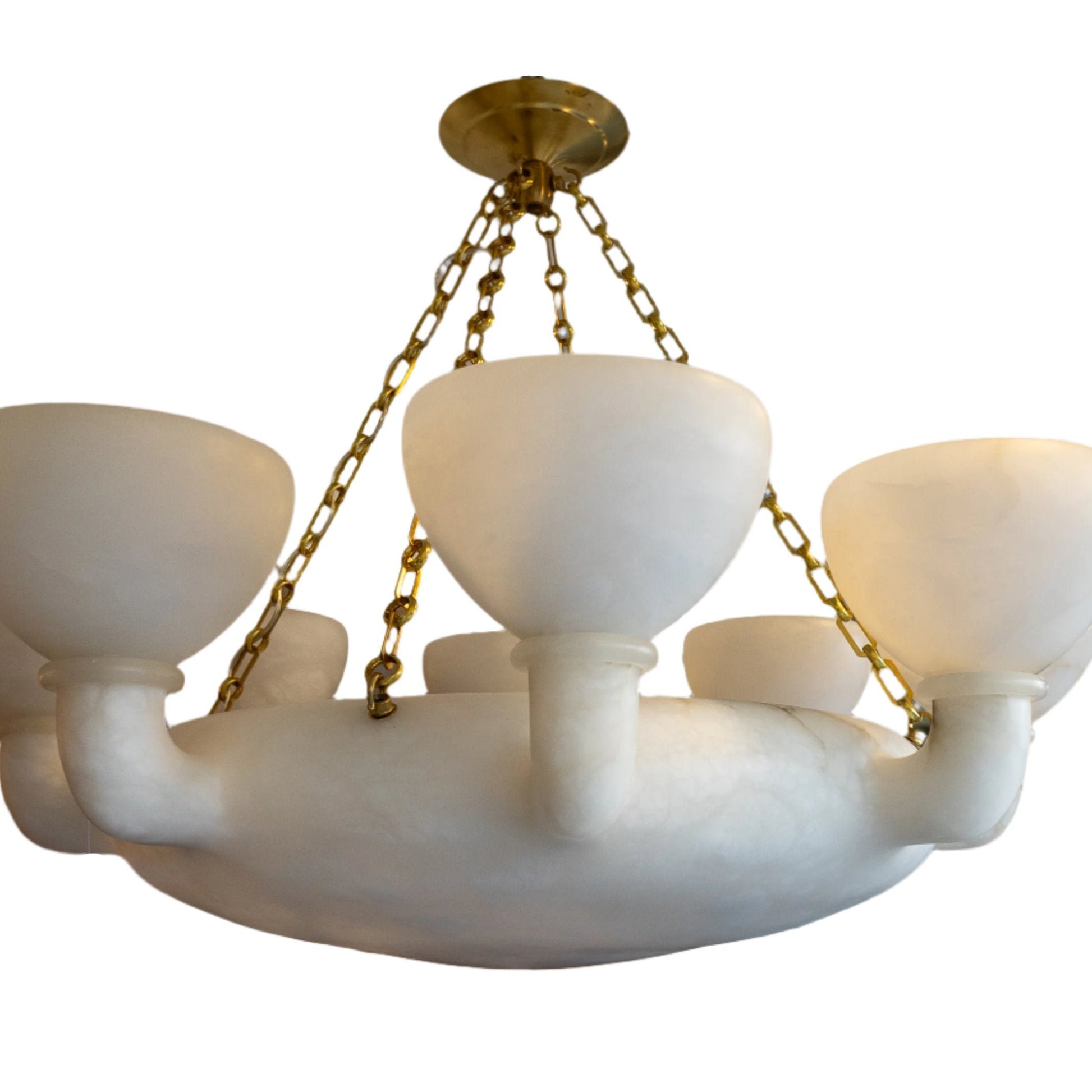 Rarely do you find an equally balanced and proportionate candelabra style fixture crafted of a single block of stone. The arms elegantly support eight alabaster shade and the fixture is suspended from brass chains and canopy. A custom rewiring is included and the option of hanging the piece from silk wrapped cords may be desirable at longer drops. Ten full size bulbs provide illumination.
