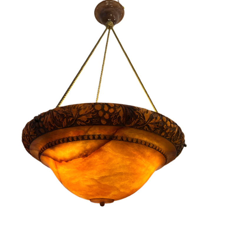Carved from a single piece of amber alabaster stone, this light fixture mounts three bulbs for soft and elegant light diffusion. The electrical wiring is concealed in silk ropes. A neo classical motif of a grapevine is carved in bas-relief on the upper rim of the fixture.