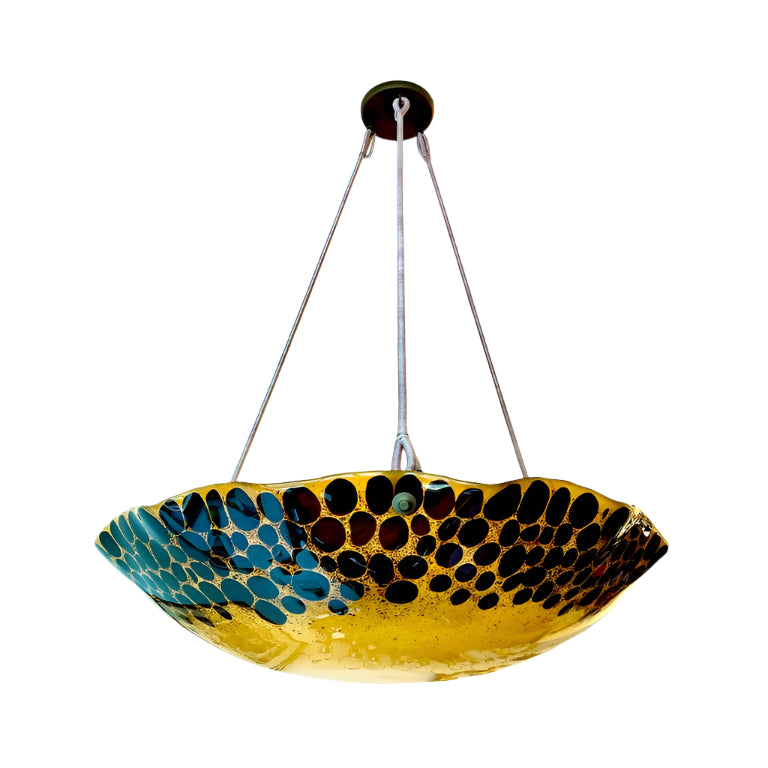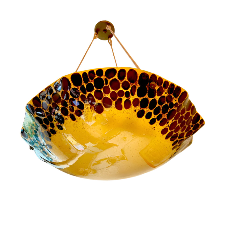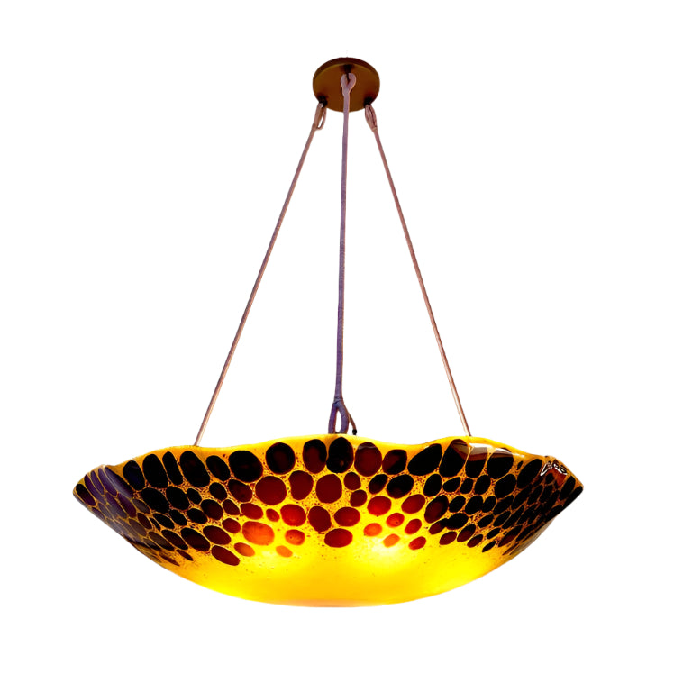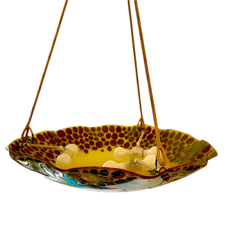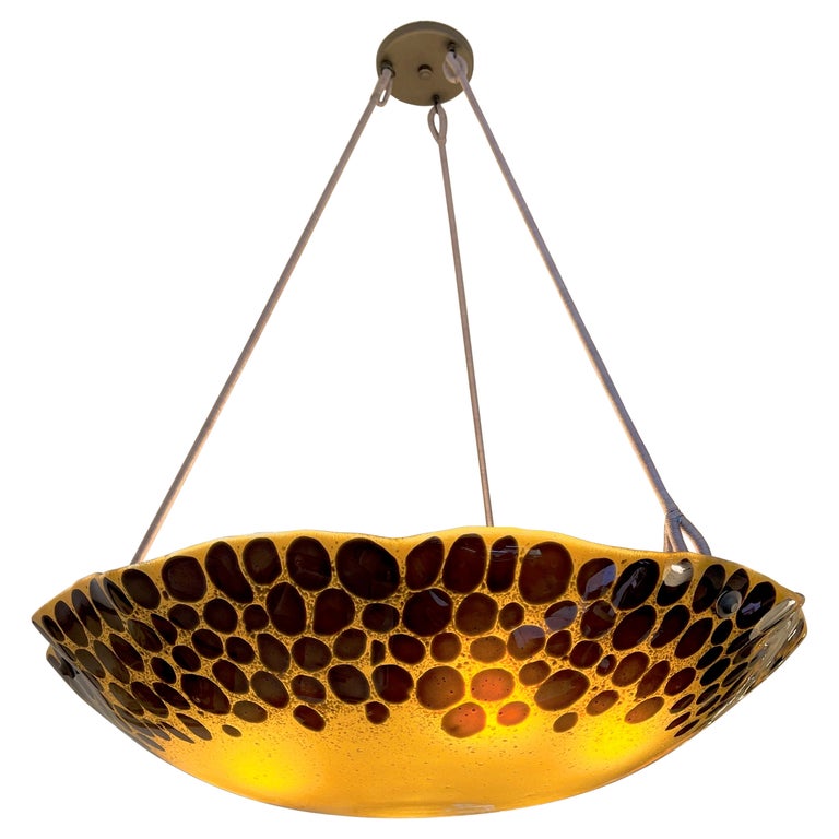 Formidably sized fixture will serve as a centerpiece and main light source for large rooms. A cloud of amber glass floats with brown leopard spots and suspends 6 full size lightbulbs (100W max per bulb). Drop may be altered at no additional charge.