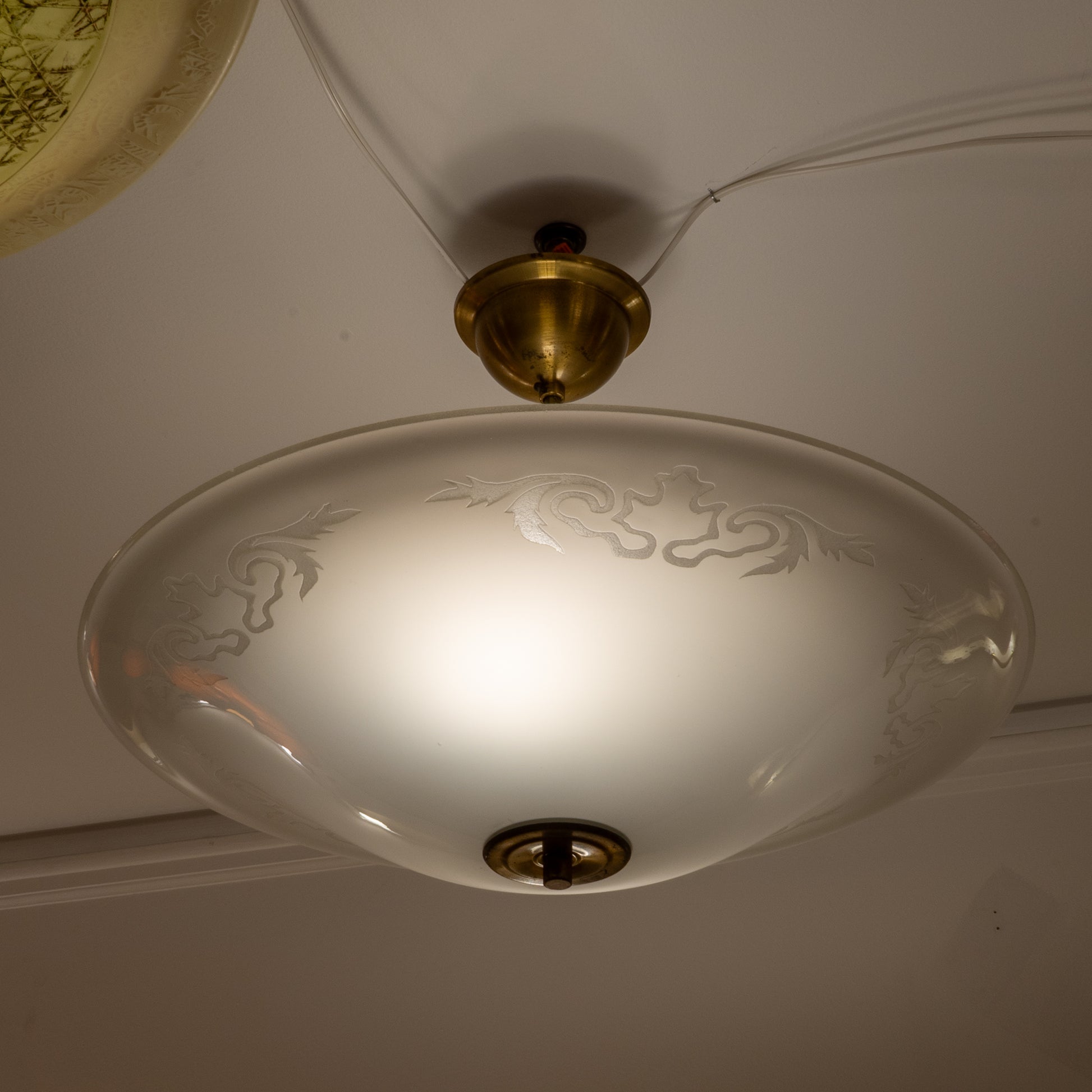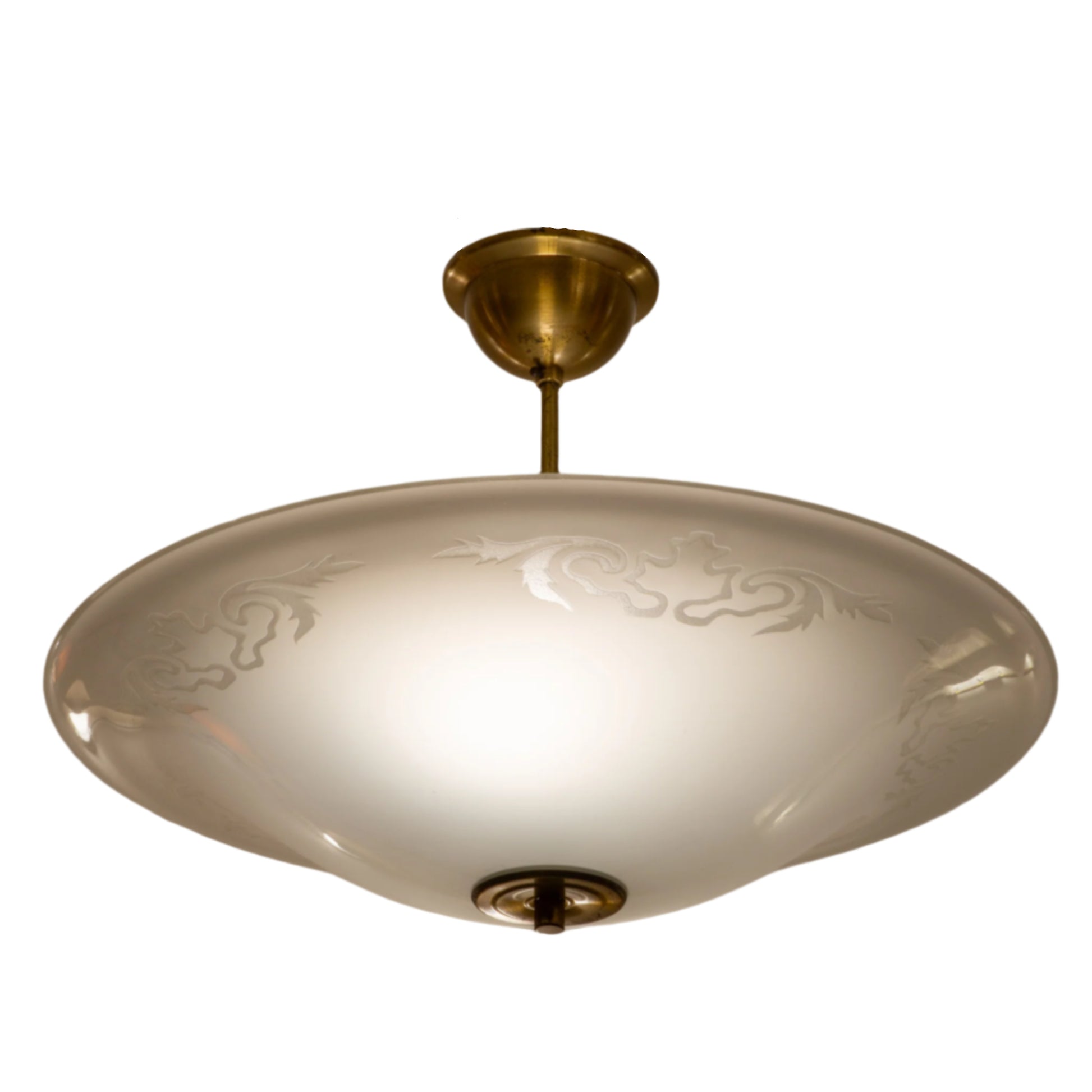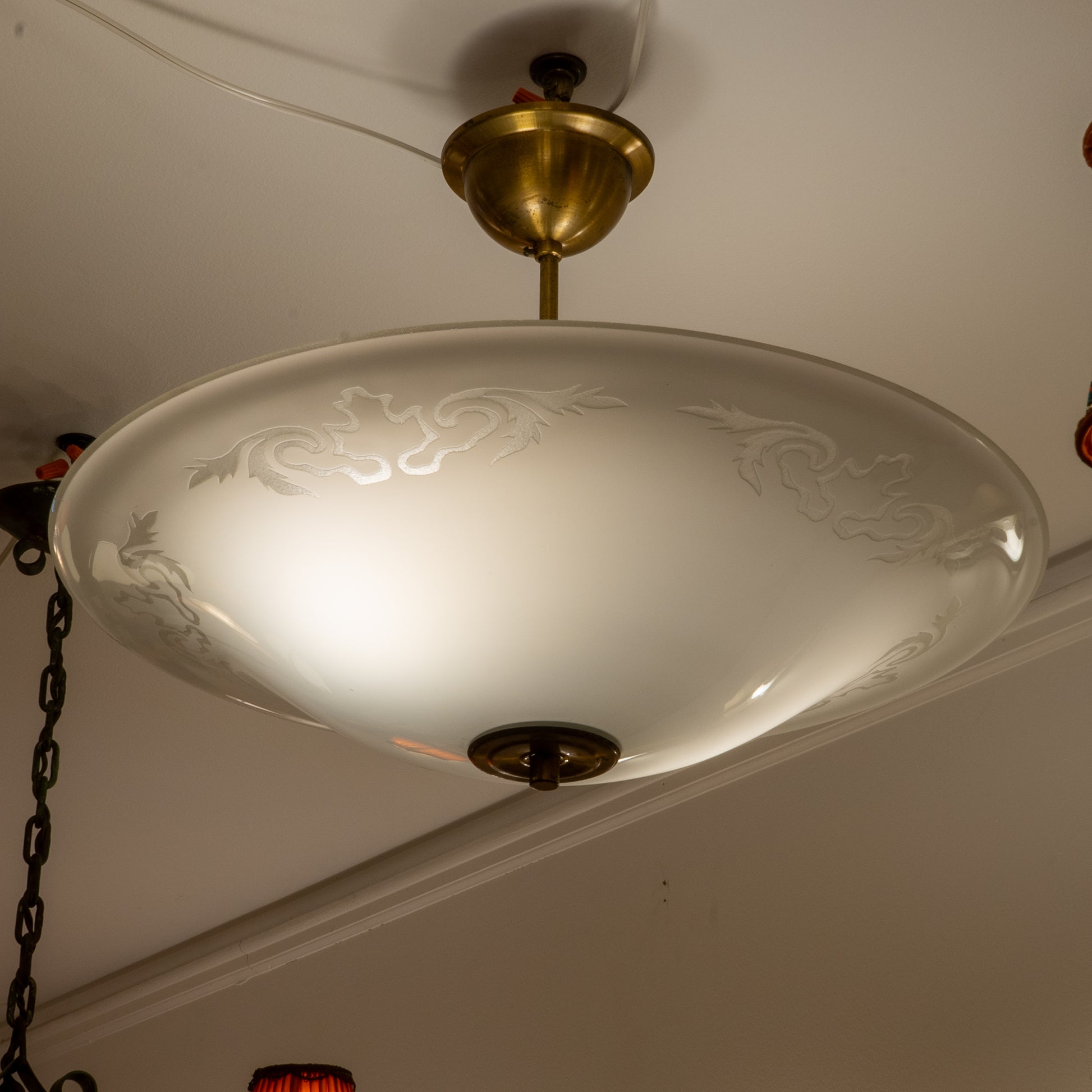 This ethereal white glass fixture is frosted on the inside and smooth on the outside. A laurel wreath motif has been reverse etched to onto the inner face of the fixture. Three standard bulbs are included (2700K/60W LED Eq./Dimmable)