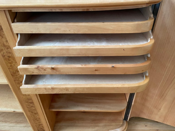 A Swedish hardwood case piece, featuring drawers and shelving secured with functional locks. Veneered in Ash, with a centerpiece of burled Ash providing drama.